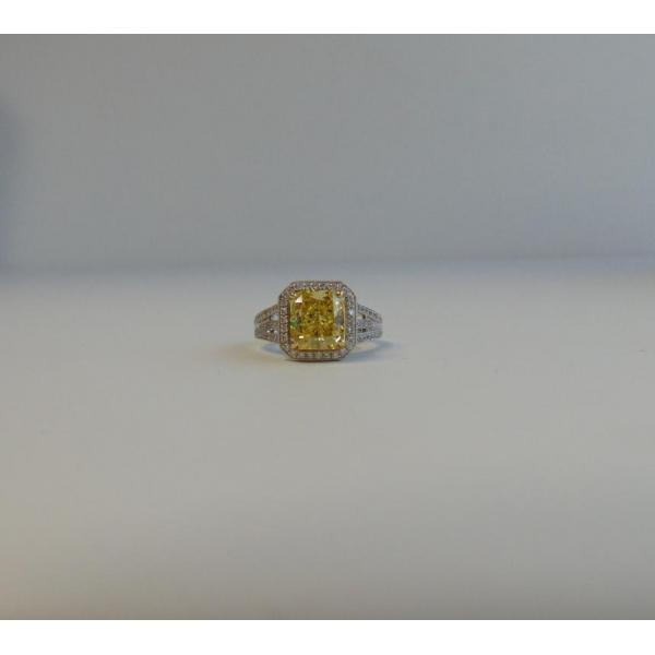 This certified Radiant fancy colored loose diamond is of 2.79-carat, Excellent-cut, natural Yellow color, and I1 clarity. This natural diamond is accompanied by a diamond grading report from GIA, and a full 30 day inspection period.