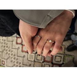 It features exquisite amethysts weighing in at approximately 0.20ctw and 0.04cts of beautiful diamond side stone accents lining the band in a simple modern design . The round cut diamonds are of G-H color and VS2-SI1 clarity. The amethysts are of eye clean clarity. This engagement ring has an approximate total carat weight of 0.24cts.