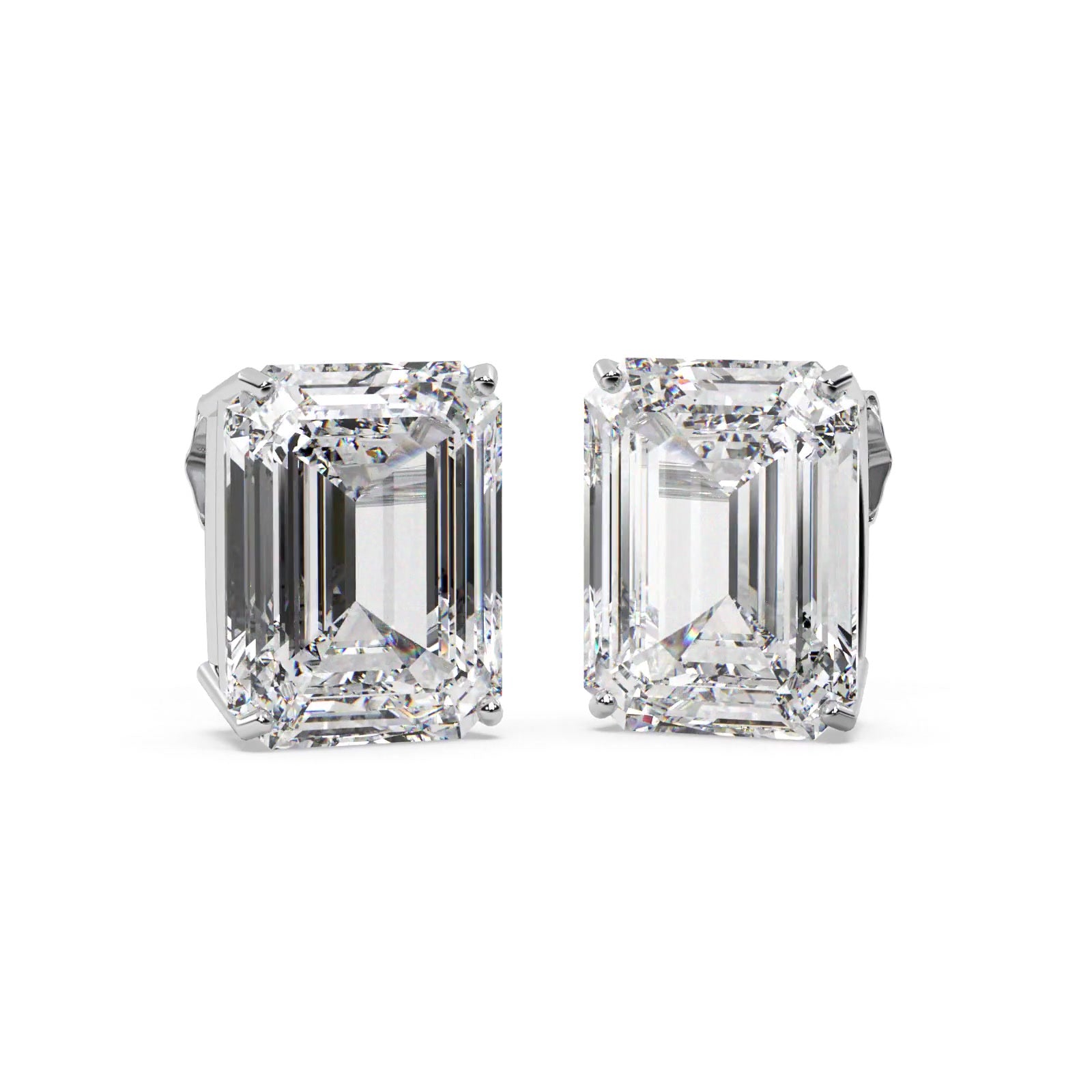 These 14k white gold stud earrings contain Emerald shaped glossy Moissanites in a prong setting.