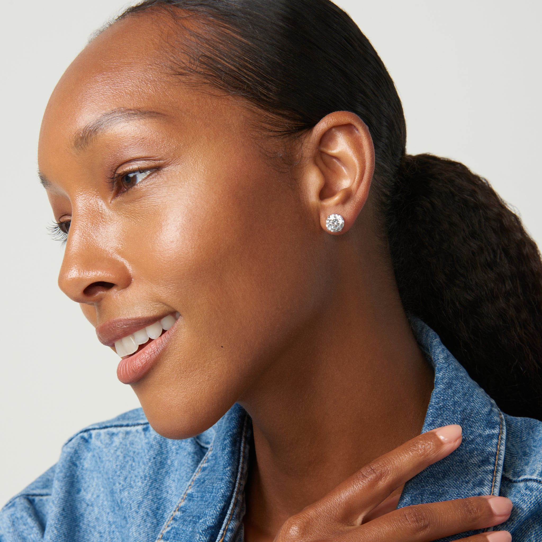 Available as screw backs or push backs, these single-stone moissanite earrings have a four carat total weight. Proudly made in USA, these studs are available in other metals, and carat weights.