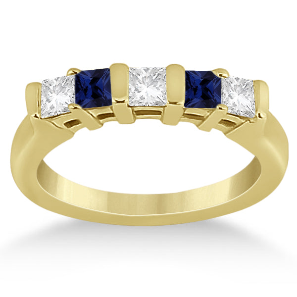 5 Stone Diamond & Blue Sapphire Princess Ring 14K Yellow Gold 0.56ct