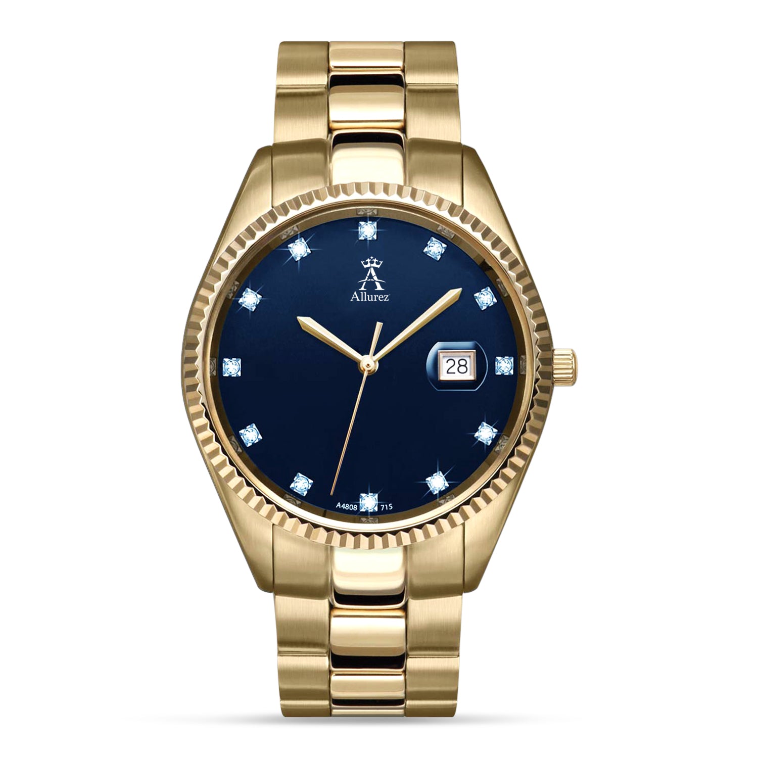 Allurez Men's Diamond Blue Sapphire Crystal Stainless Steel Gold Bracelet Watch