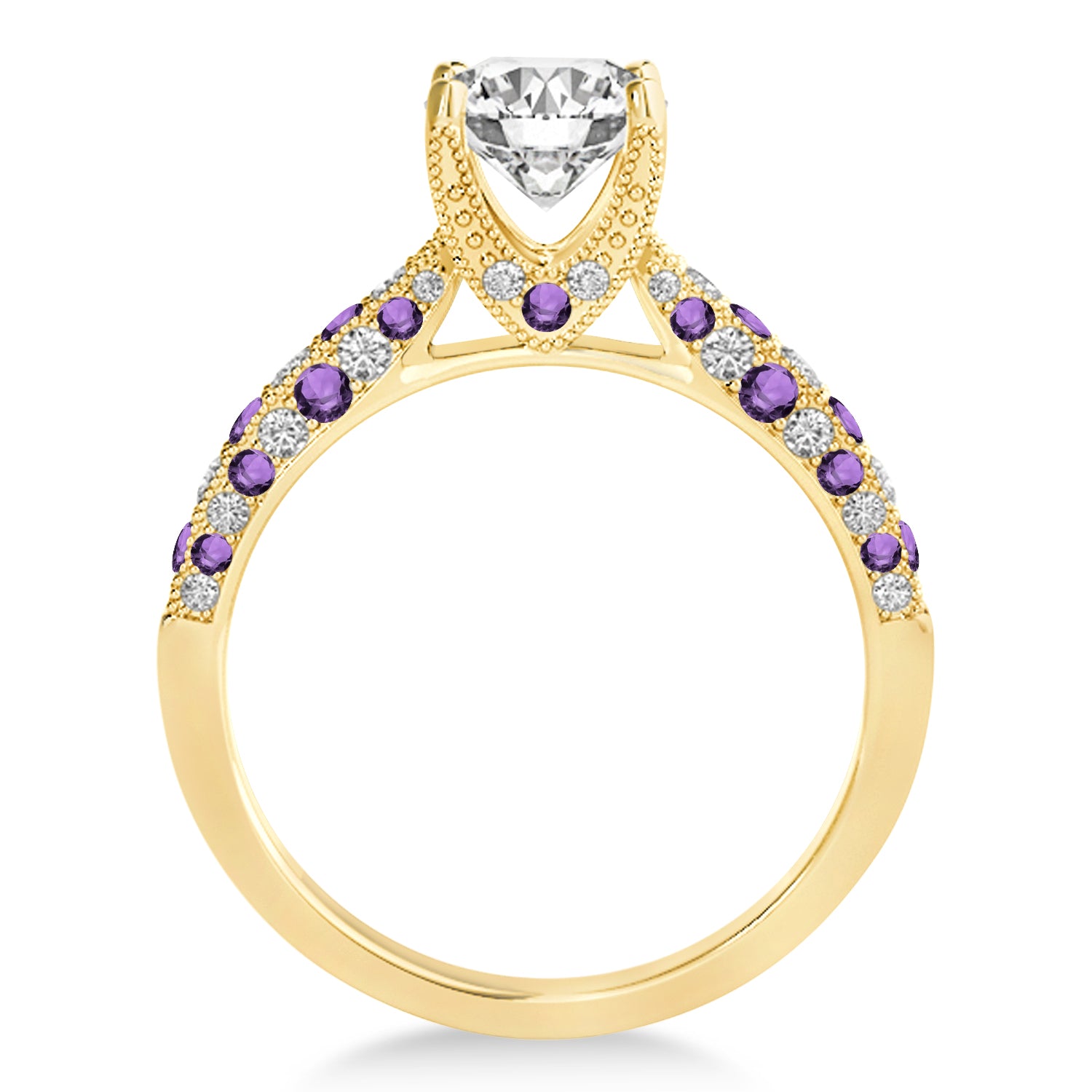 Crafted with an inspiring combination of 30 alternating Amethysts & Diamonds and the center stone of your choice, this 14k Yellow Gold engagement ring is a true gem. Featuring diamonds of SI1-SI2 clarity and G-H color, this engagement ring's quality is of the highest degree.