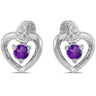 These unique and romantic heart shaped 14k white gold earrings feature a 3mm round amethyst In each earring, and 2 round diamonds above the gemstone.