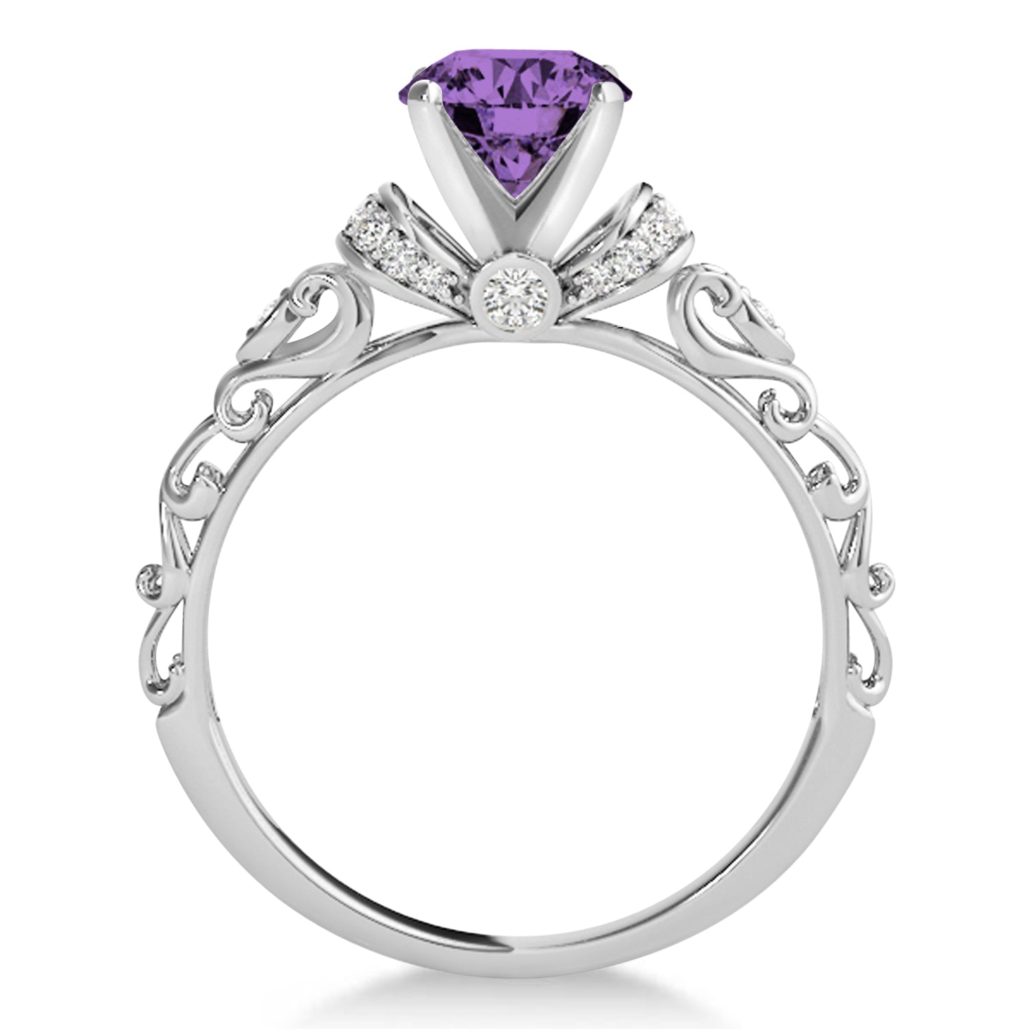 This glittering design combines both modern and vintage-inspired touches in a unique engagement ring your future bride is sure to adore. It features two diamond-lined "collars" showcasing a sparkling 1.50-carat weight amethyst center stone. A pair of smaller diamonds are prong-set within the shank's gleaming platinum open-scroll design, along with 18 additional accent diamonds.