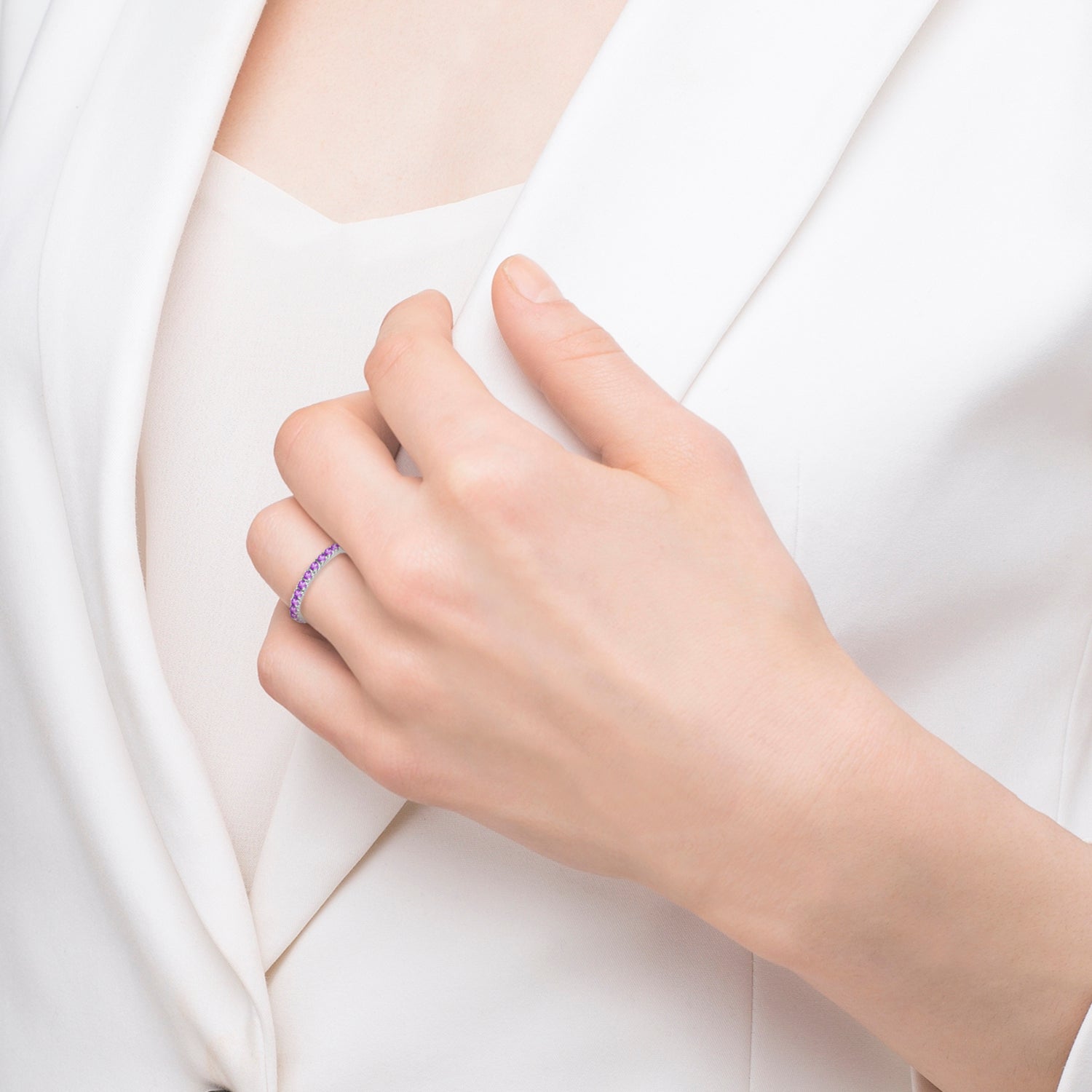 Twenty-seven purple Amethysts are circling all the way around this unique and modern gemstone eternity...