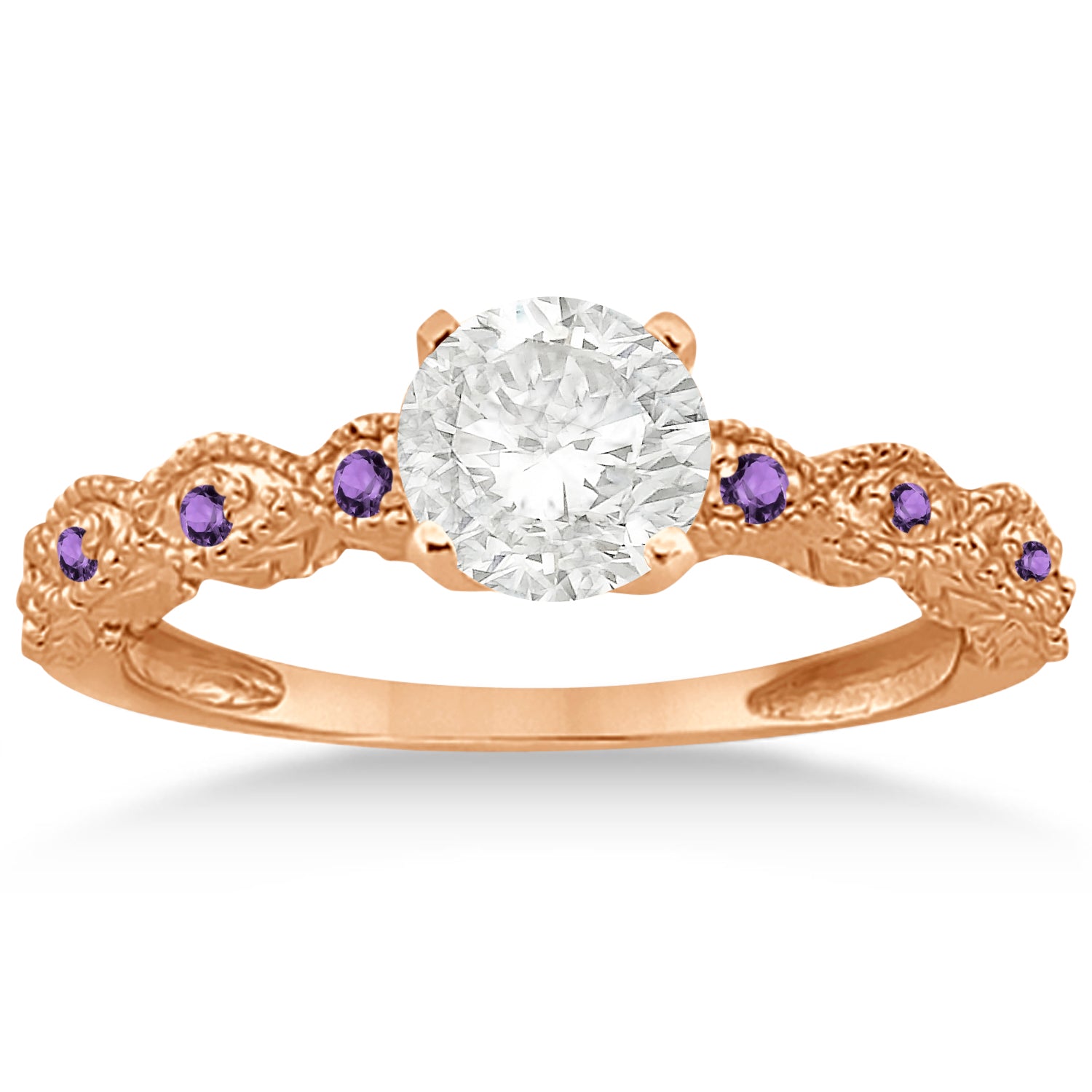 A total of 16 amethysts set in a 14K rose gold setting adorn this side stone accented engagement ring and matching wedding band. The bright purple gemstones are featured in a pave setting.