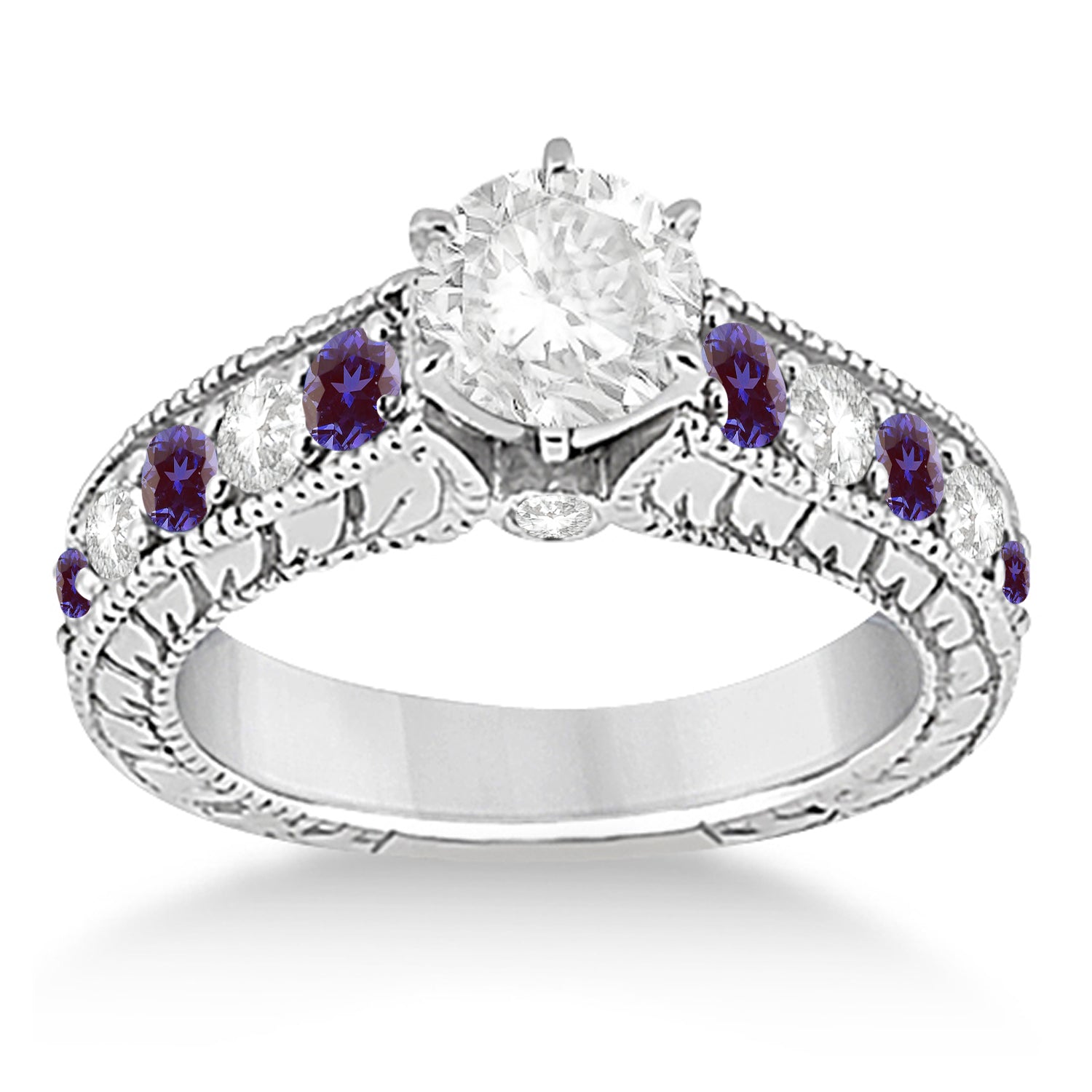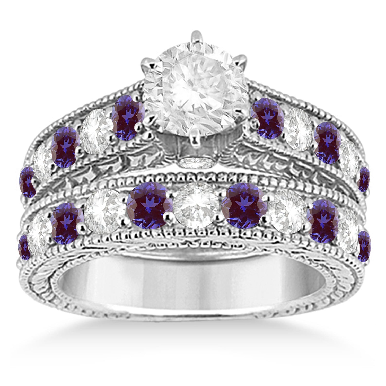 This classic 18kt white gold engagement ring with matching wedding band is side stone accented with round cut diamonds and lab grown alexandrites. A total of 23 gemstones surround a prong mounting with an interchangeable head for a full range of customization options. Design your own engagement ring with a center stone of your choice.