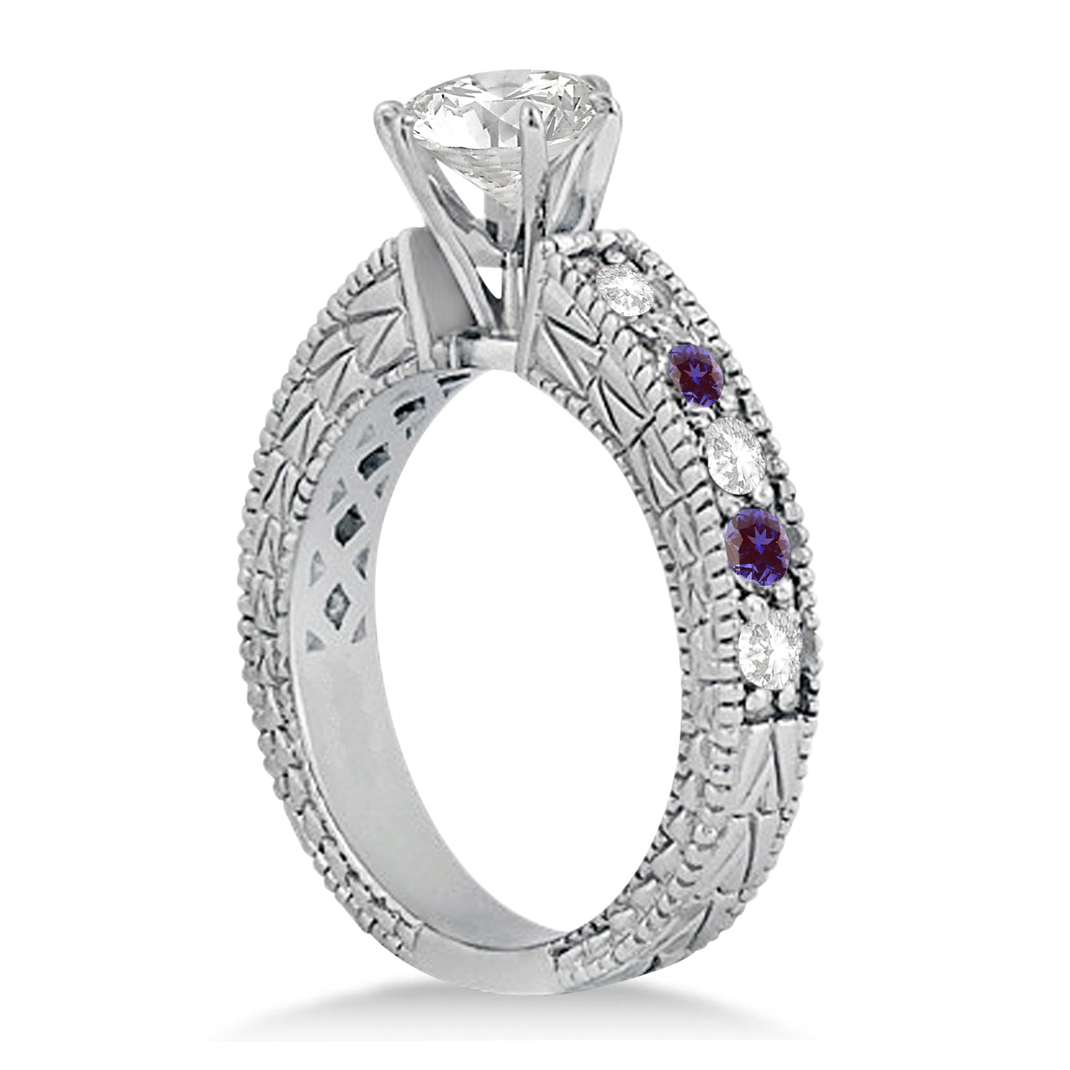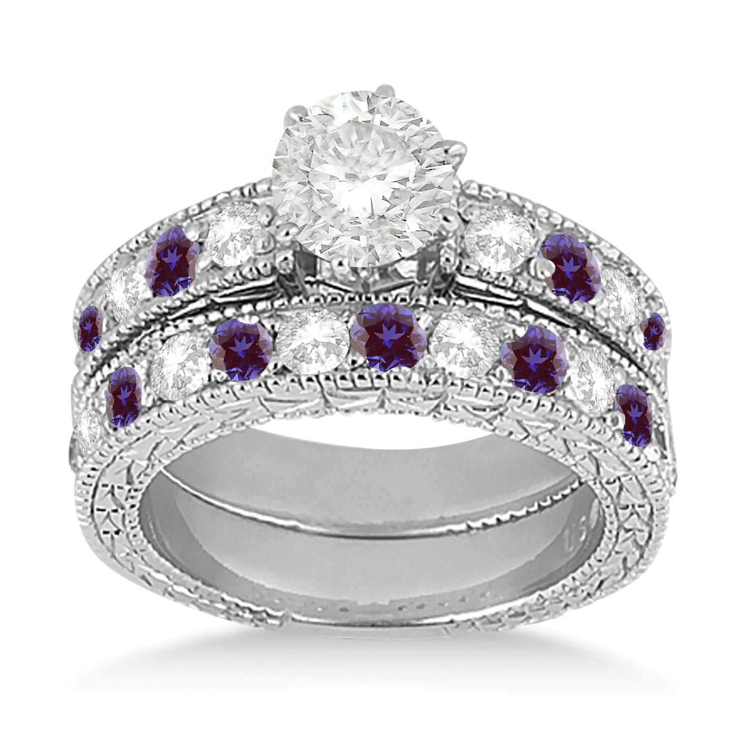 The antique scroll work and the milgrain edges add the ultimate designer's touch to these 18kt White Gold genuine colopurple gemstone bridal ring set.