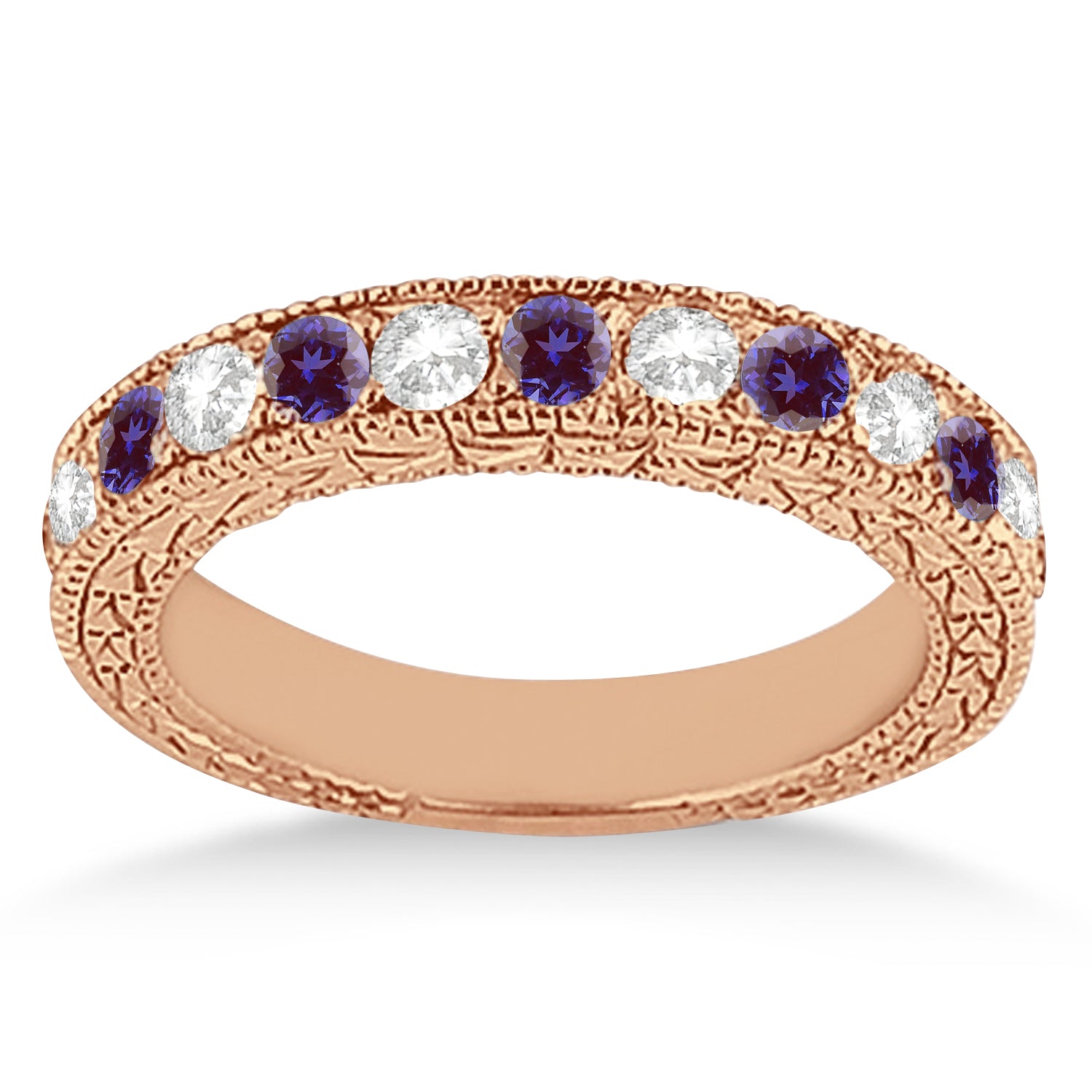 This vintage lab grown alexandrite and diamond wedding ring features 7 brilliant cut VS2 G-H round diamonds alternating with 6 colopurple gemstones.