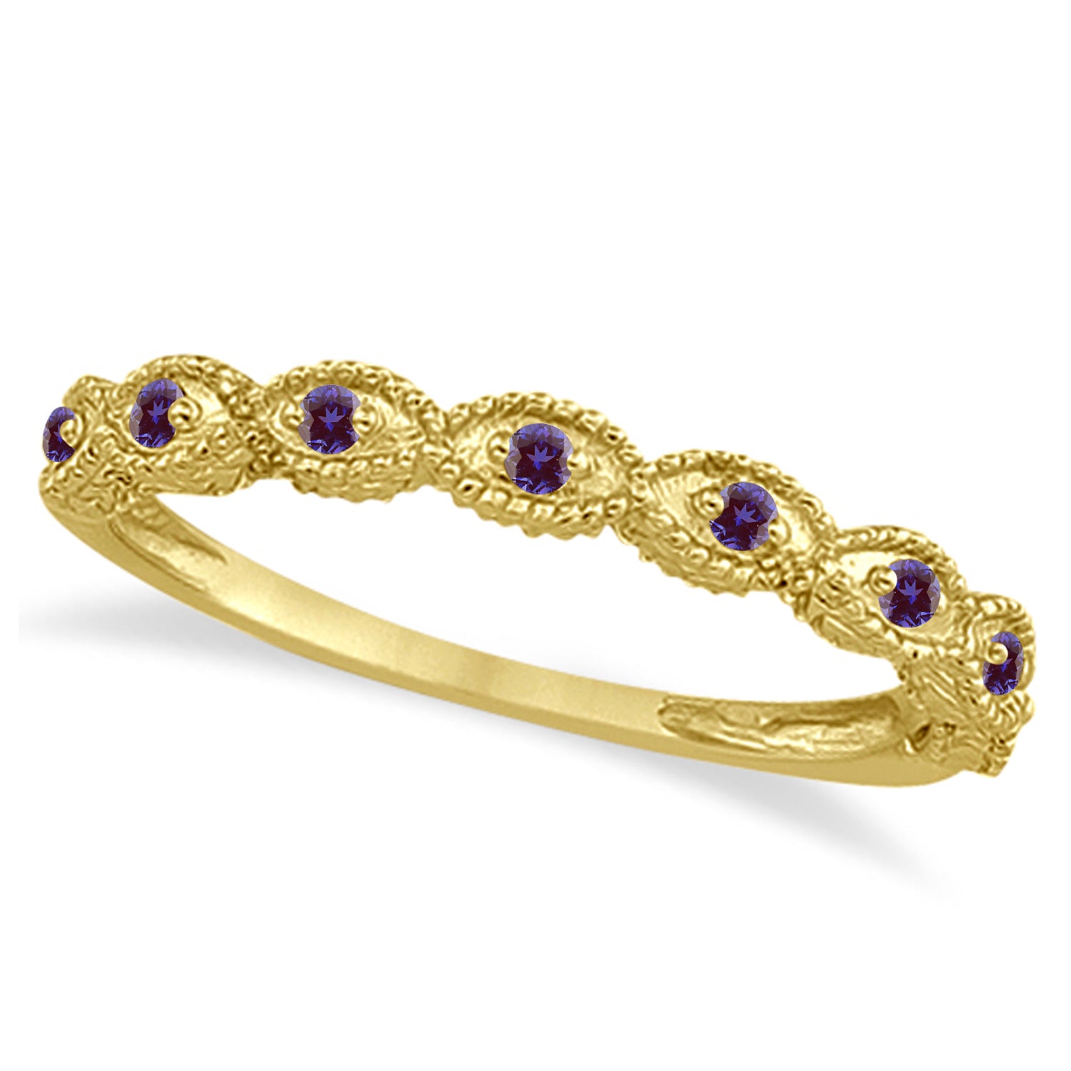 This heirloom gemstone engagement ring with matching wedding band with hand set colored stones is available in other metals and colored gems.