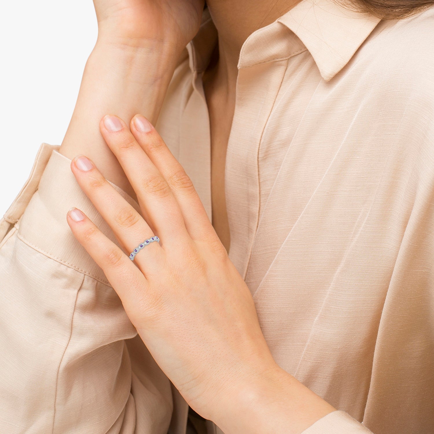 This classic gemstone wedding ring is crafted in 14K white gold with 8 amethyst gemstones that sparkle in the light.