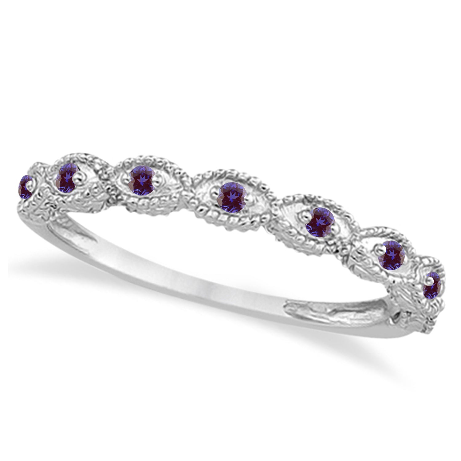 The bridal band features marquise shapes that hold the bright purple gemstones along the sides of the center prong mounting.