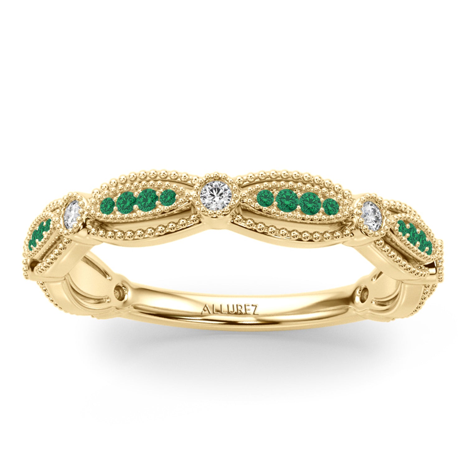 Discover the Antique Style Emerald & Diamond Engagement Ring with Matching Wedding Band in 14K...