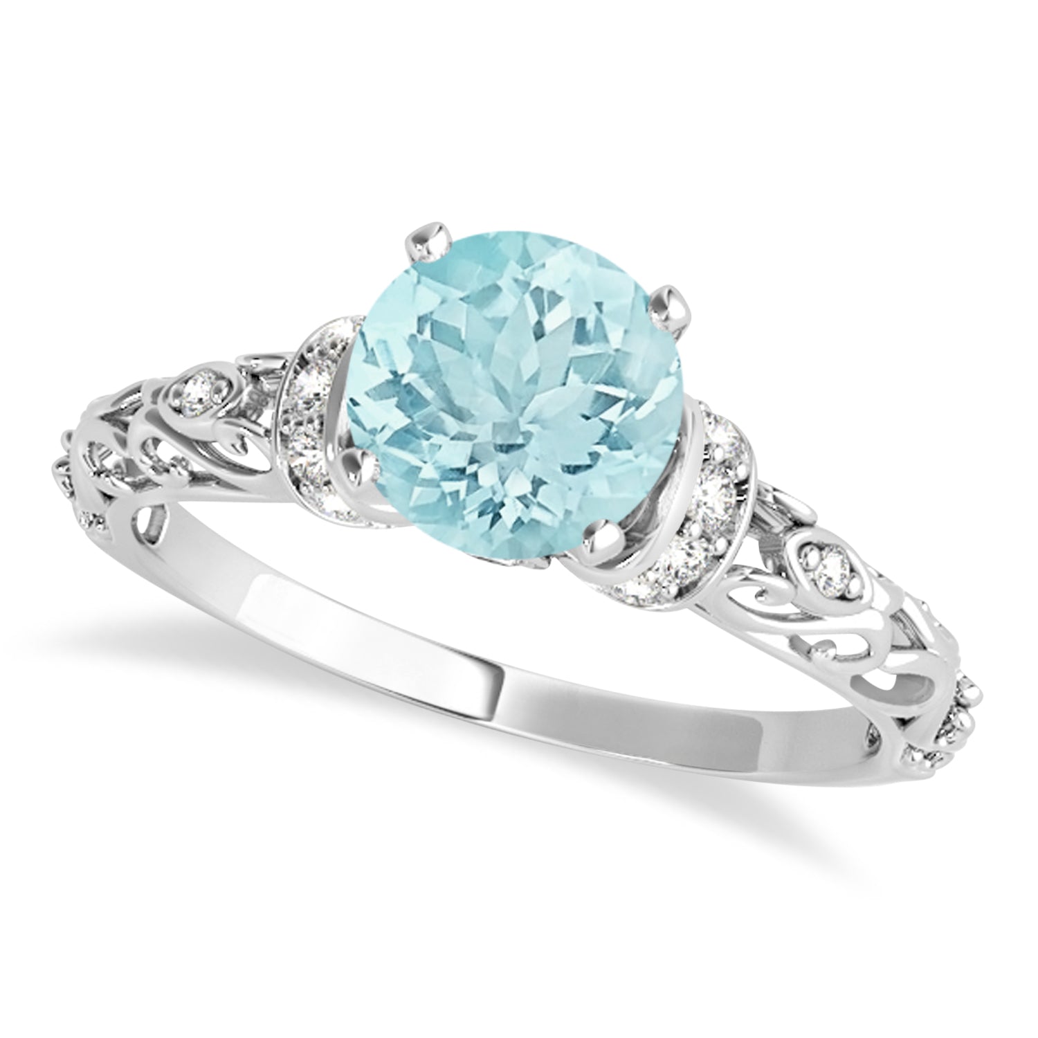 This glittering design unites both modern and vintage-inspired touches in an engagement ring your future wife will adore. It features pair of diamond-lined "collars" showcasing a sparkling 1.50-carat weight aquamarine center stone. Two smaller diamonds are prong-set within the shank's 18k white gold open-scroll design, along with 18 additional accent diamonds.