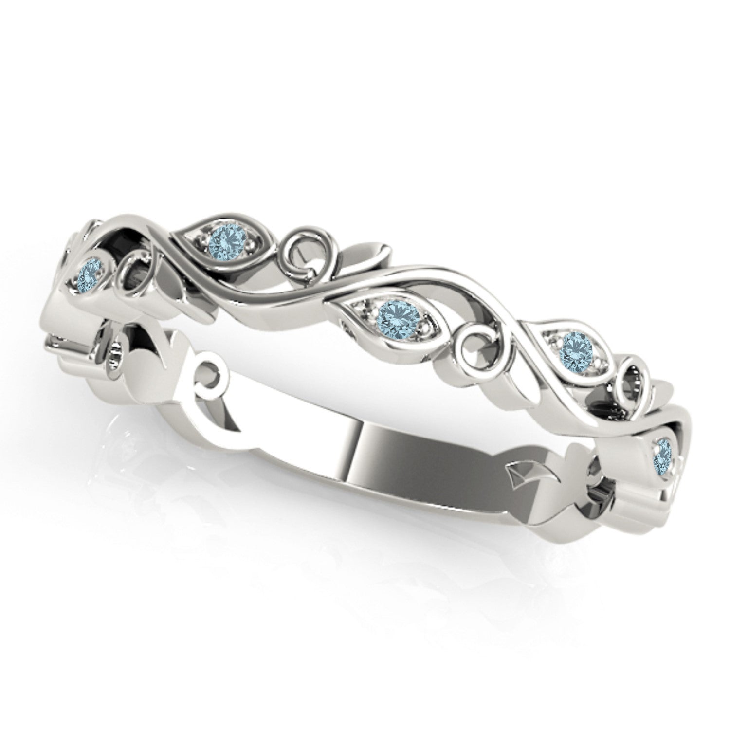 This 0.05ct aquamarine leaf wedding band will add a natural element to your look. The ring is constructed of 14k white gold, and is shaped in a leaf vine pattern along the majority of the band. The vines display 9 prong set aquamarines of 0.05ct in weight. The stones are blue and eye clean. This ring will brighten any woman's appearance.