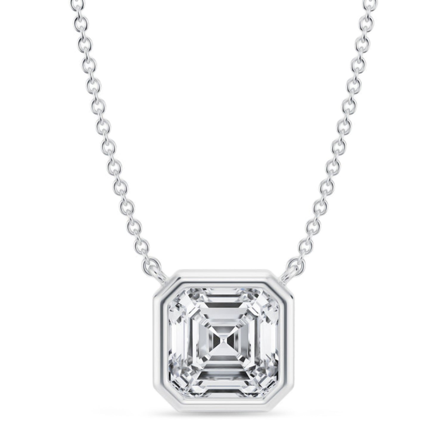 Add a touch of grandeur to your collection with this Asscher Lab Diamond Solitaire Pendant Necklace in 14K White Gold. Featuring a radiant 2.50ct lab grown diamond in a bezel setting, it dazzles with crisp facets and vintage inspired charm. The Asscher cut delivers bold elegance through its symmetrical, step cut design. Perfect for elevating both everyday and formal looks. A timeless expression of luxury and style.