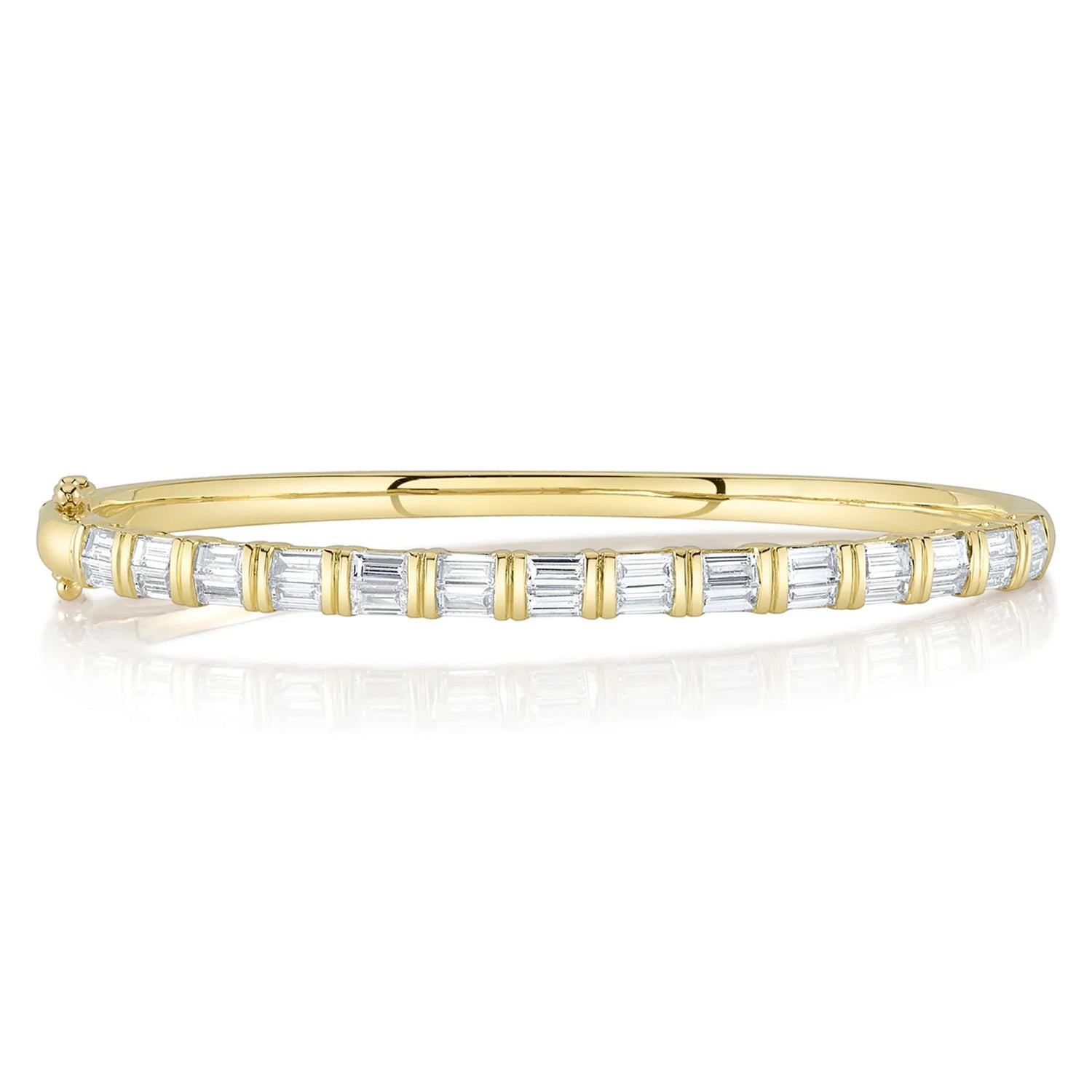 Elevate your style with this exquisite Baguette Diamond bar Bangle Bracelet crafted in lustrous 14K Yellow Gold. Boasting 2.34 carats of sparkling baguette diamonds in a sleek bar setting, this luxurious bracelet secures with a safety box clasp for peace of mind. Perfect for adding sophistication to any outfit.