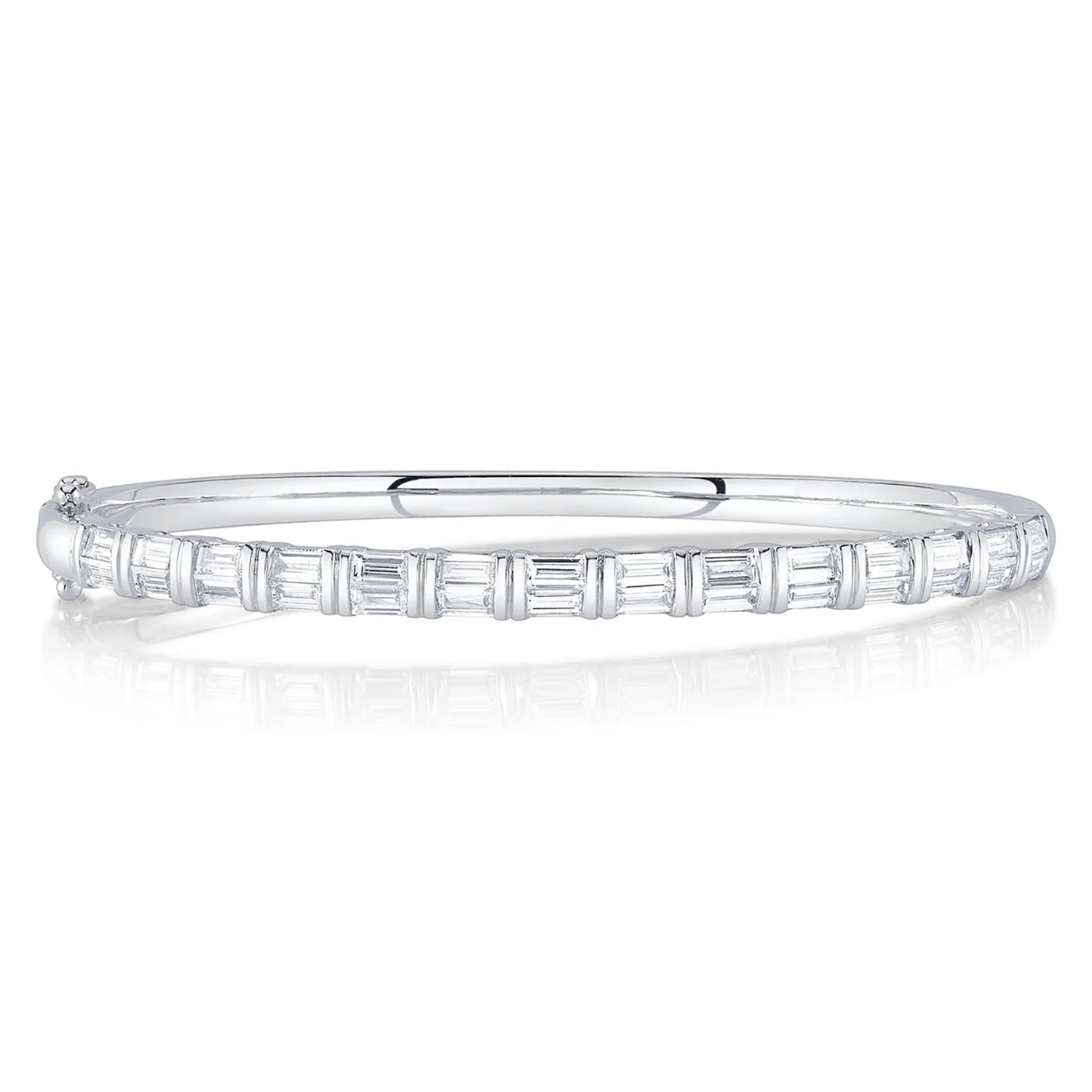 Elevate your style with this exquisite Baguette Lab Grown Diamond bar Bangle Bracelet crafted in lustrous 14K White Gold. Boasting 2.34 carats of sparkling baguette diamonds in a sleek bar setting, this luxurious bracelet secures with a safety box clasp for peace of mind. Perfect for adding sophistication to any outfit.