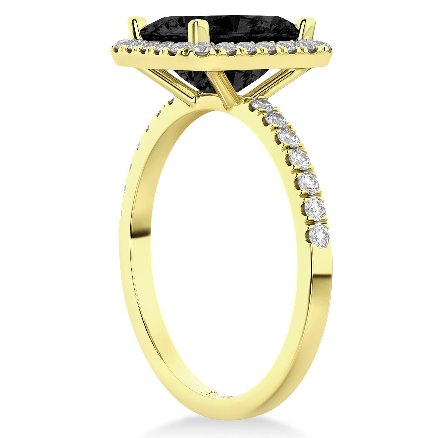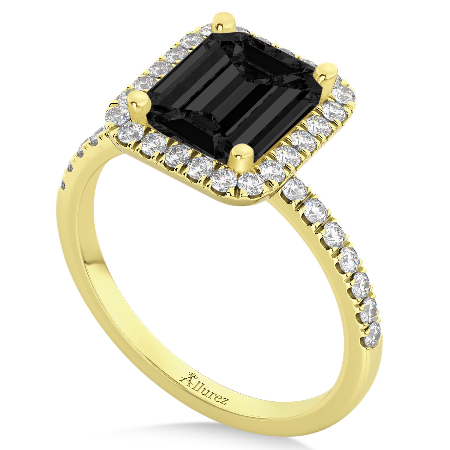 The prong set diamonds form a border around the black diamond creating a rectangular halo, and also travel halfway down the ring's 18k yellow gold band.