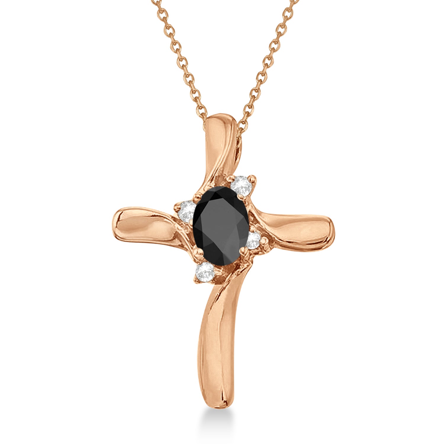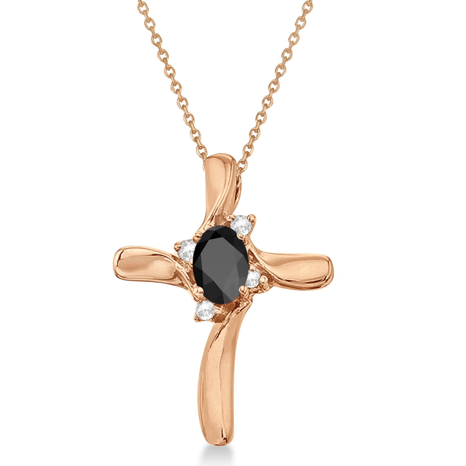 Artistry and faith merge to create this striking 14kt rose gold gemstone cross pendant made of glittering diamonds of 0.05ct in prong setting that are circling a large oval shaped 0.45ct Black Onyx.