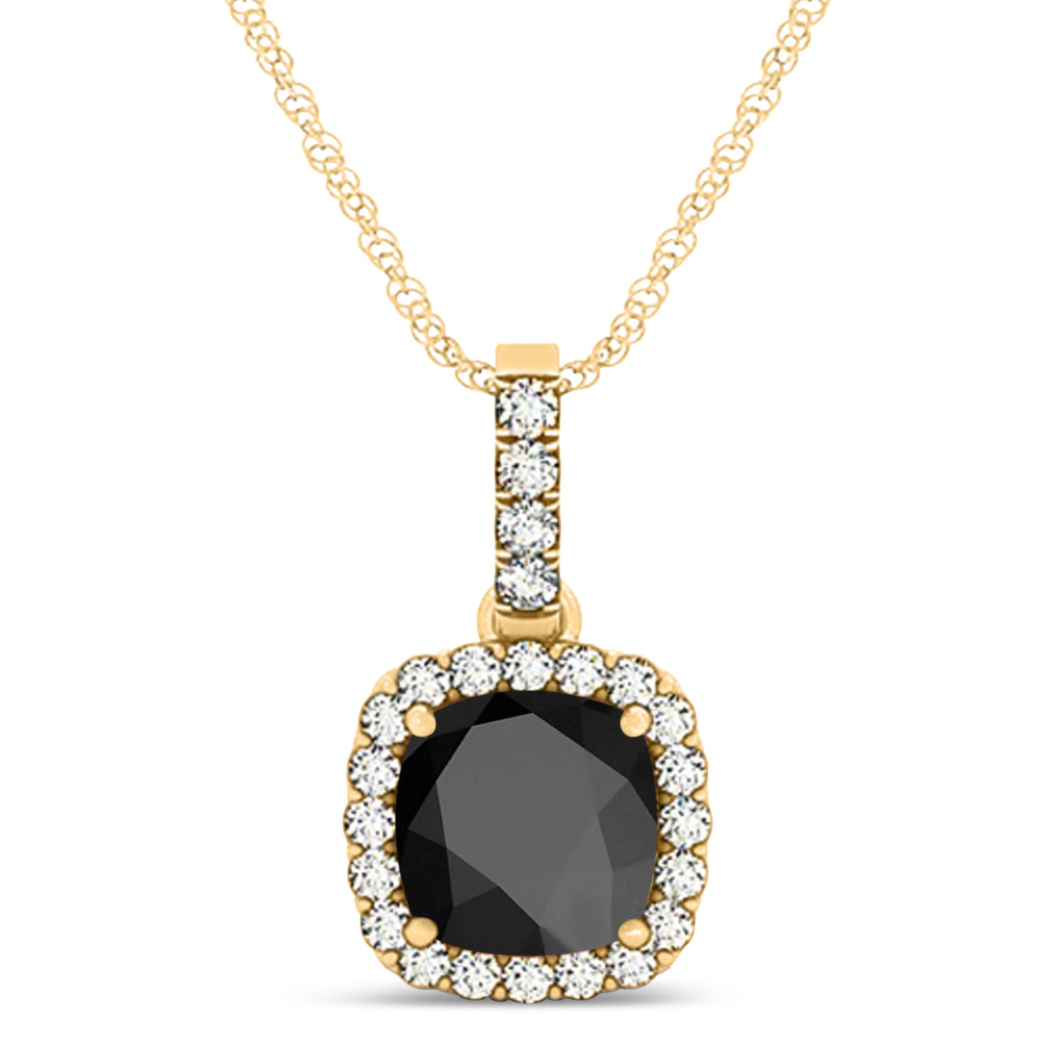 Black Onyx & Diamond Halo Cushion Pendant Necklace 14k Yellow Gold (1.