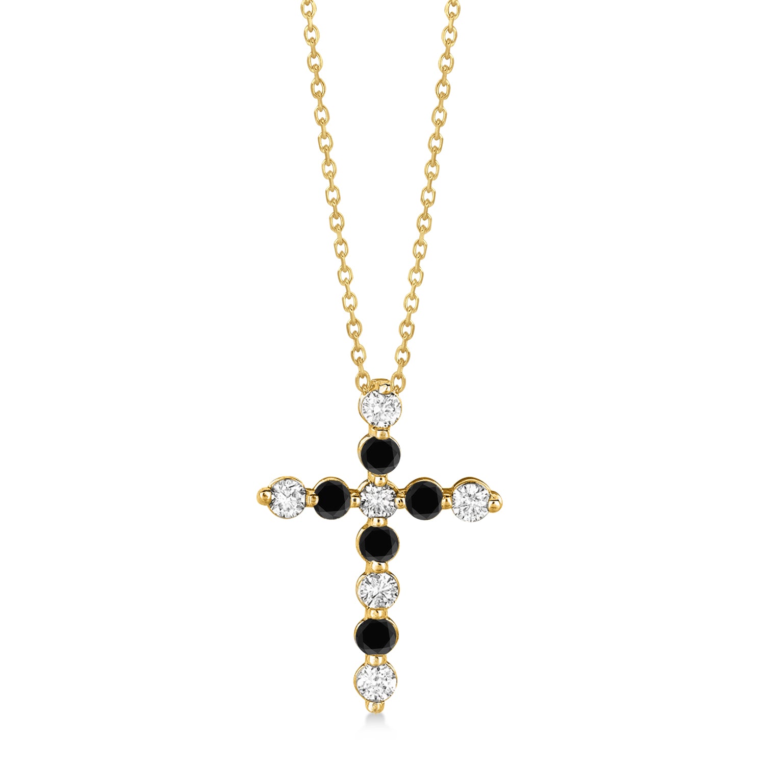 Black & White Diamond Cross Pendant Necklace in 14k Yellow Gold (1.01ct)