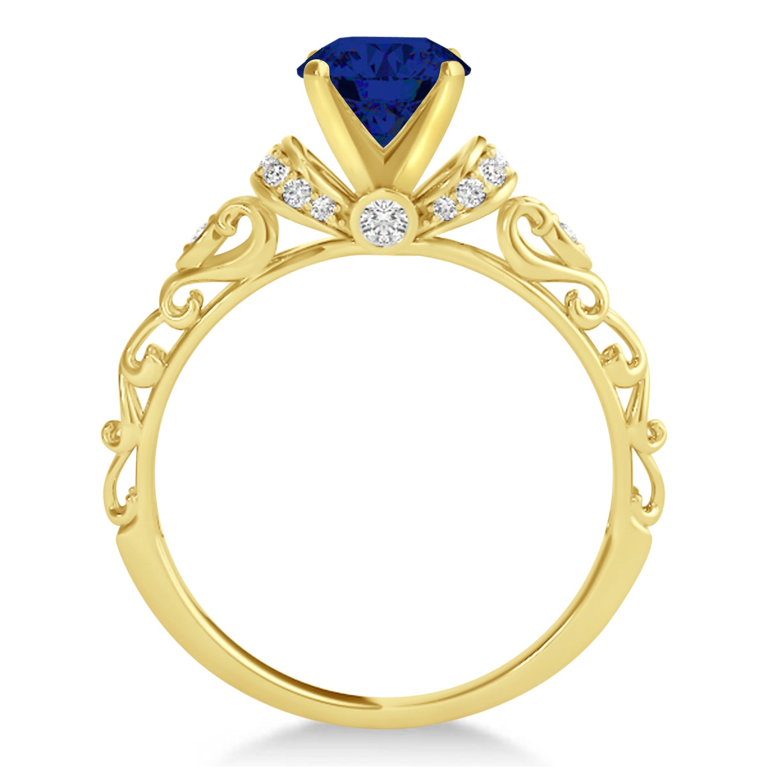 The engagement ring features a pair of diamond-lined "collars" designed to showcase a glittering blue sapphire center stone. Additional accent diamonds are set within the shank's decorative open scrollwork.