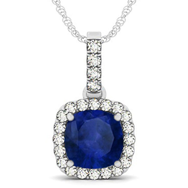 Wow the crowd with this beautiful 14k white gold blue sapphire and diamond halo cushion pendant necklace.