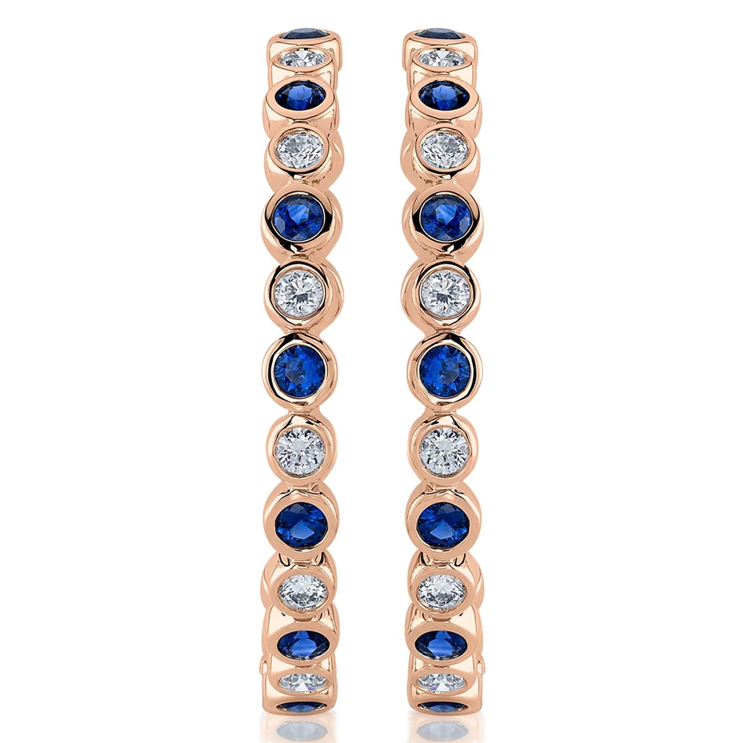Elevate your elegance with our Blue Sapphire & Diamond Hoop Earrings in 14K Rose Gold. These stunning earrings feature alternating deep blue sapphires and sparkling diamonds, totaling 2.23 carats. The classic hoop design, combined with the luxurious contrast of sapphires and diamonds, creates a timeless piece perfect for any occasion.
