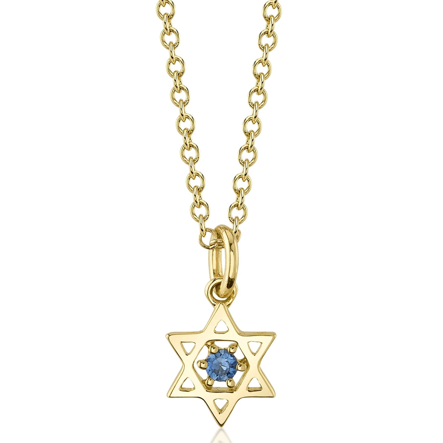 Blue Sapphire Jewish Star of David Petite Pendant Necklace 14K Yellow Gold (0.03ct)