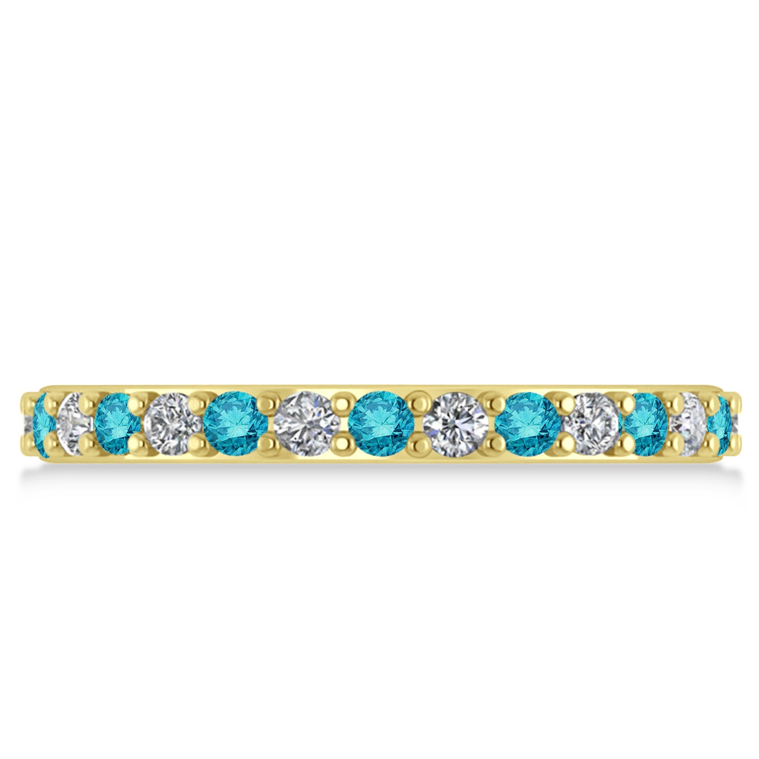 Set in 14k yellow gold, 14, prong-set, round diamonds and 15, prong-set, round blue diamonds surround the entirety of the thin wedding band, in a breathtakingly unique style.