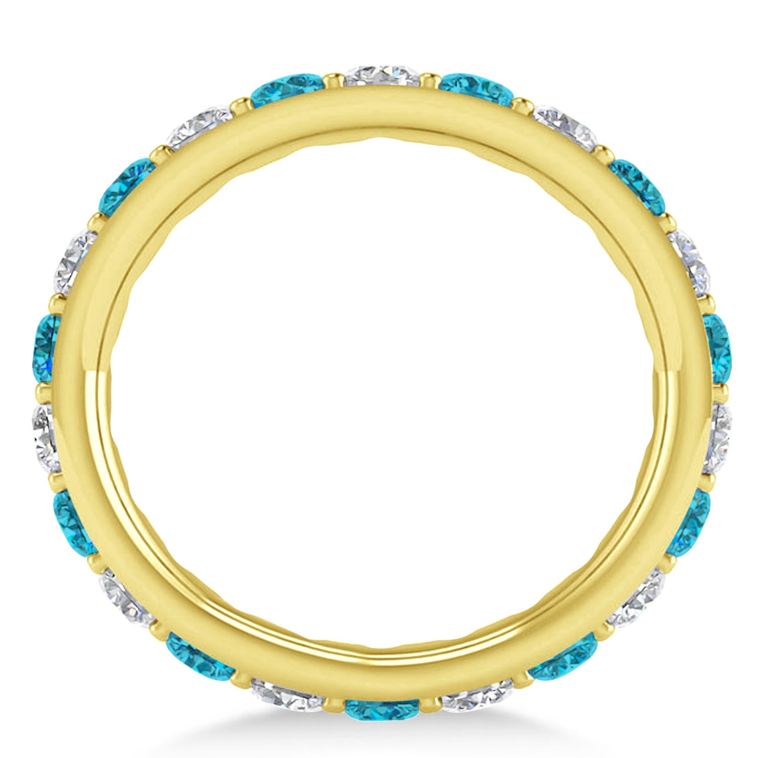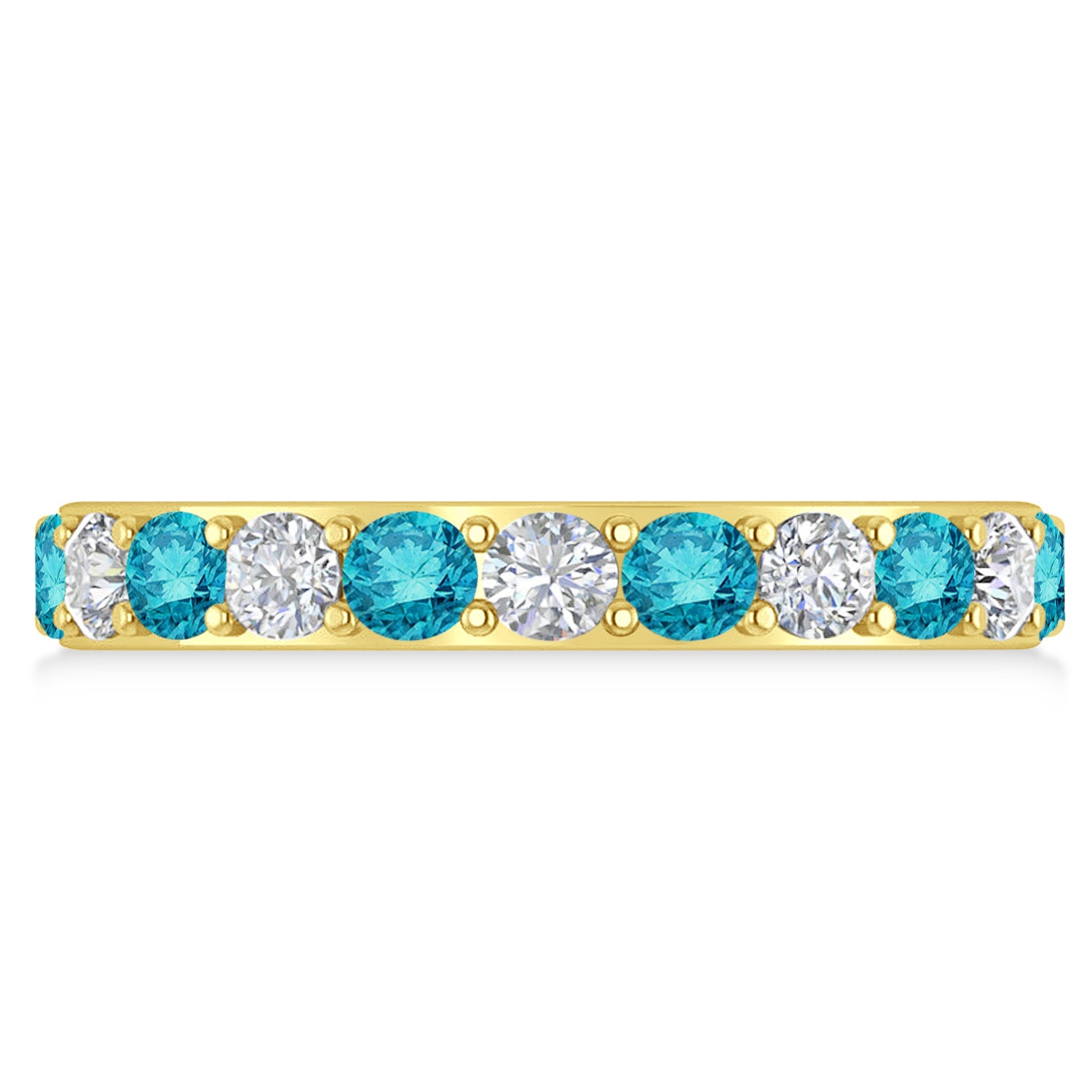 Set in 14k yellow gold, 11, prong-set, round diamonds and 11, prong-set, round blue diamonds surround the entirety of the wedding band, in a breathtakingly unique style.