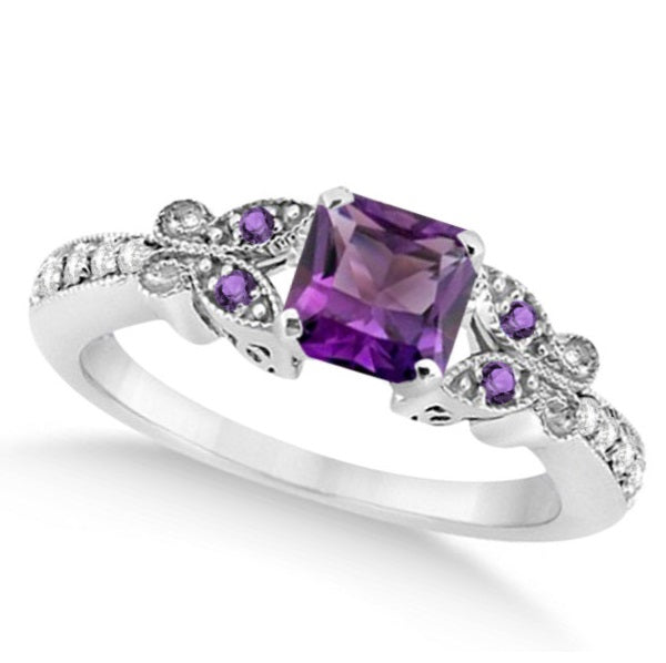 Long reserved solely for royalty, the amethyst is a majestic gemstone your queen is sure to love, especially in this butterfly designed amethyst and diamond princess engagement ring.
