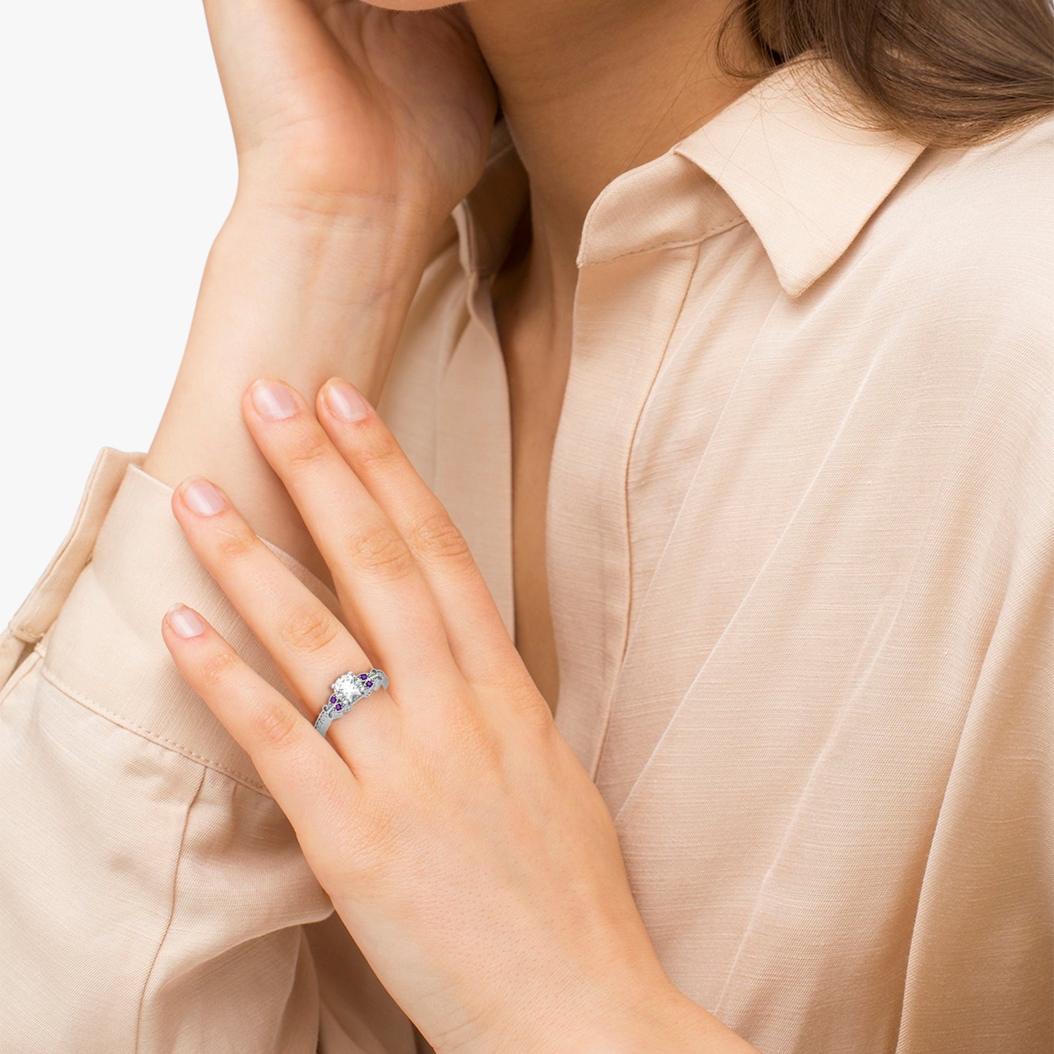 This diamond and amethyst engagement ring is available in a number of additional gemstones and metals.