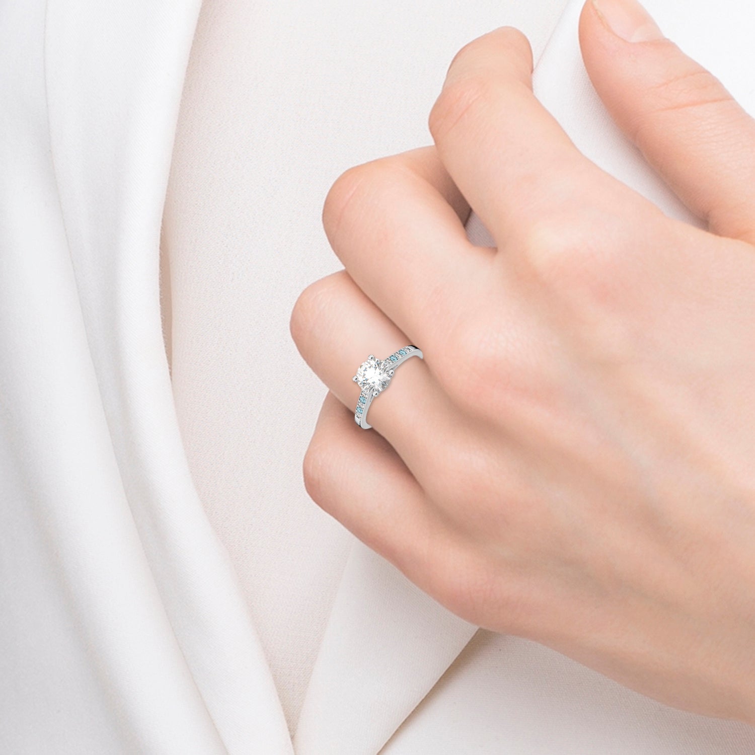 The center prong mounting is surrounded by these blue gemstones and diamonds, each as beautiful as it is completely natural. Customize your one-of-a-kind engagement ring by selecting a center diamond in the carat weight of your choice.