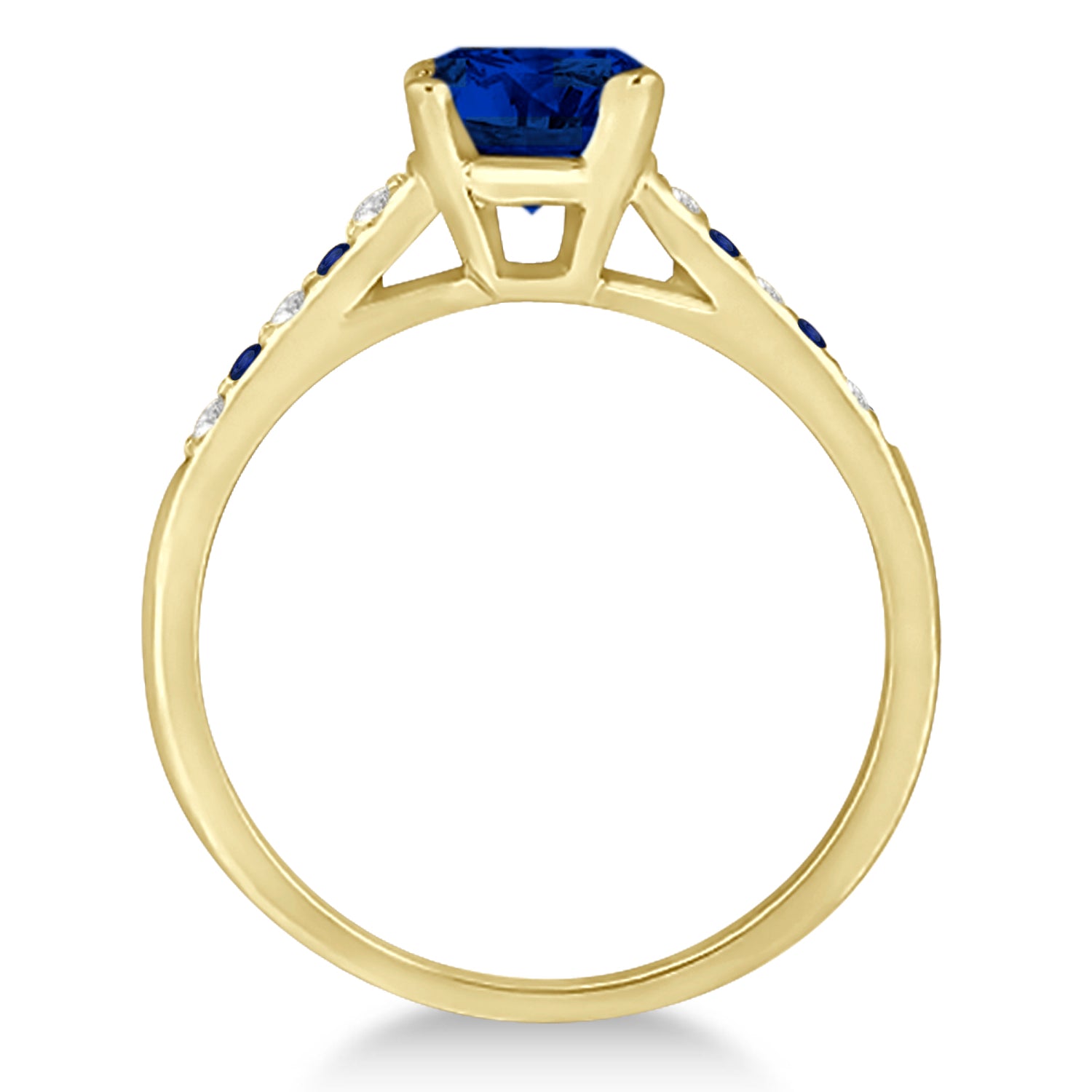 A perfect flourish for your proposal, this engagement ring setting made of 14kt Yellow gold is accented with round-cut diamonds and blue sapphires. Our peerless selection of four September birthstones and six G-H/SI1-SI2 diamonds are a stunning combination with this pave set cathedral band.