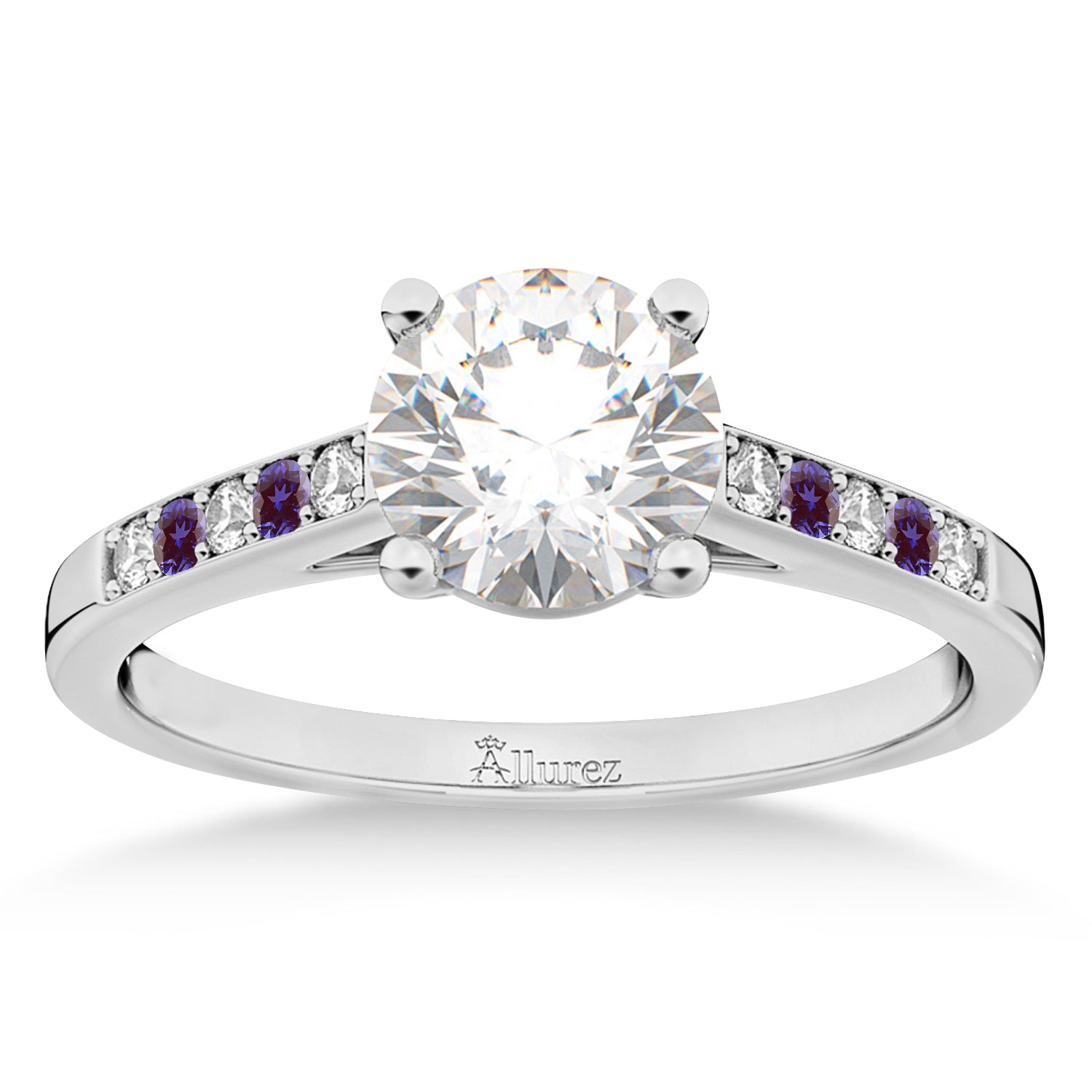 The natural, genuine colored gemstone purple lab grown alexandrites and G-H/VS diamonds sit on both sides of a selectable center stone prong mounting.