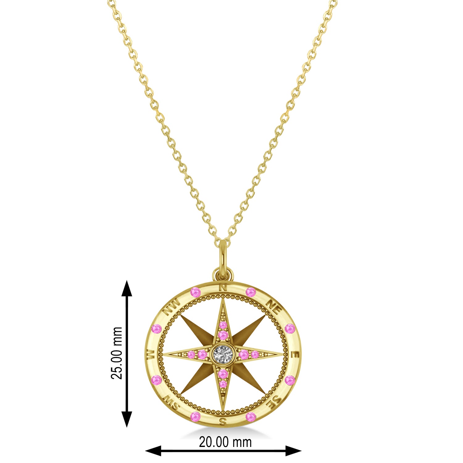 This stunning diamond accented & pink sapphire compass pendant necklace is truly a gorgeous, standout piece. The nautical inspired compass measures 20mm in diameter and the height including the bail is 25mm.