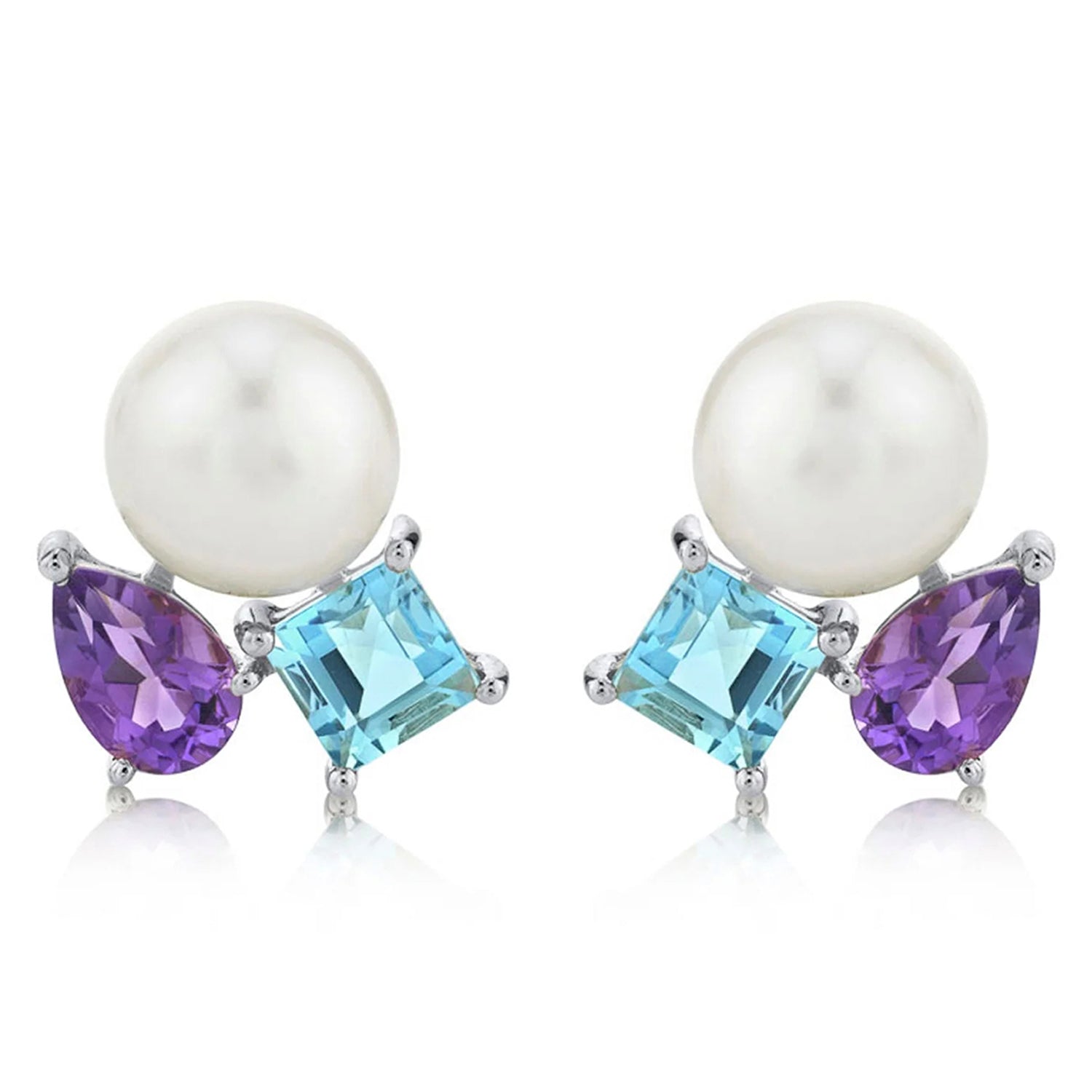 Cultured Pearl & Amethyst Blue Topaz Stud Earrings 14K White Gold (1.57ct)