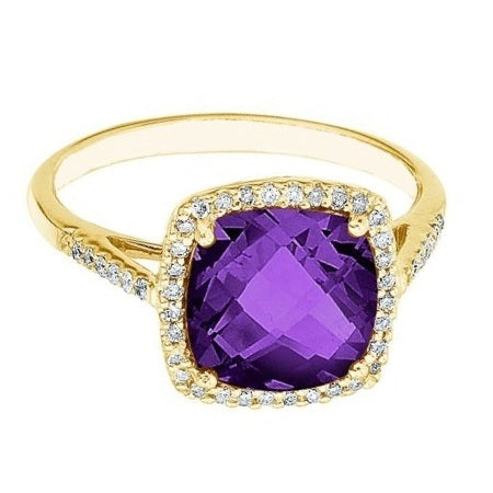 This gorgeous gemstone and diamond 14k yellow gold halo right-hand fashion ring features a large cushion-cut 8mm purple amethyst that is accented by 0.20 carat total weight of brilliant cut round diamonds. Make a statement with this unique and modern ladies ring.
