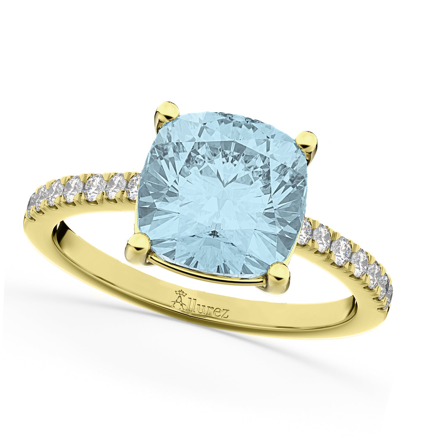 Cushion Cut Aquamarine & Diamond Engagement Ring 14k Yellow Gold (2.81ct)