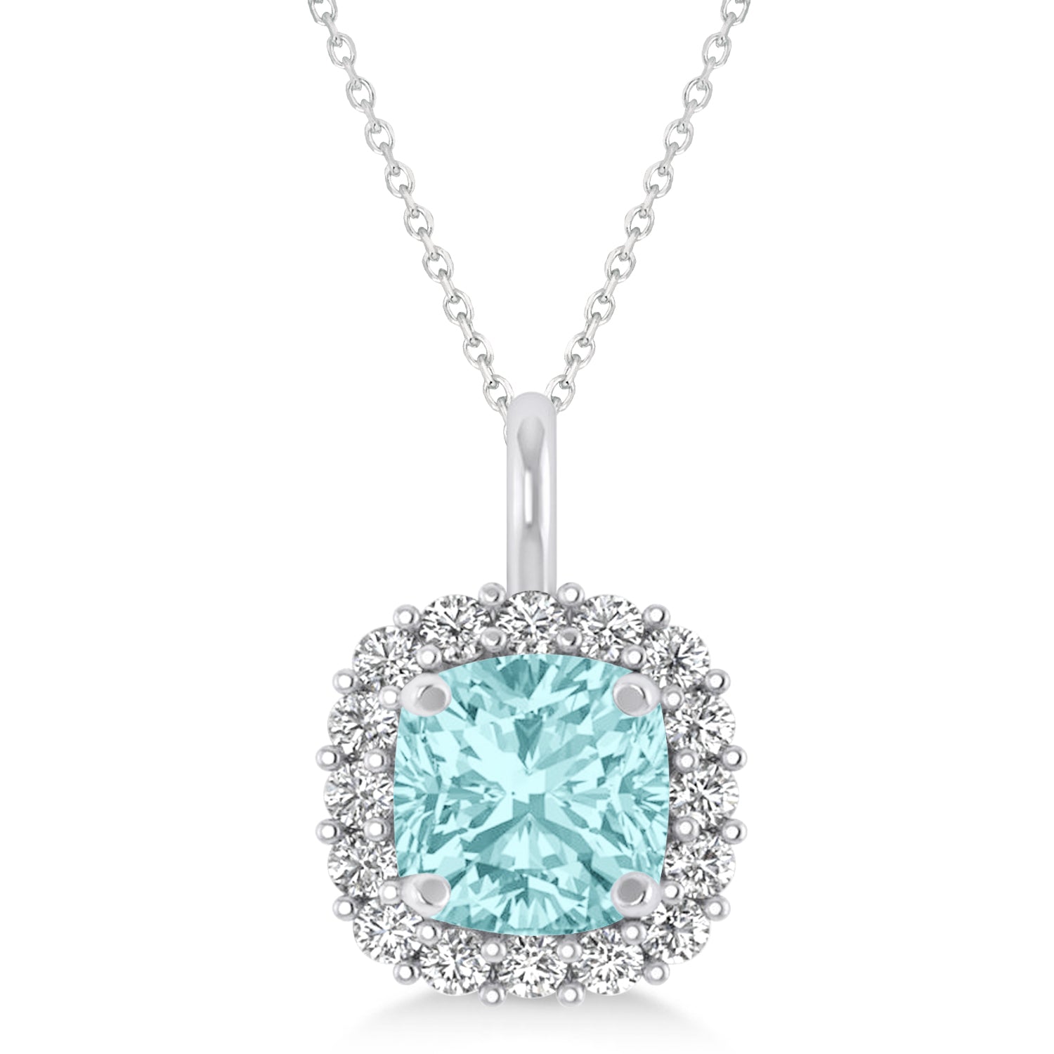 Cushion Cut Aquamarine & Diamond Halo Pendant 14k White Gold (0.92ct)