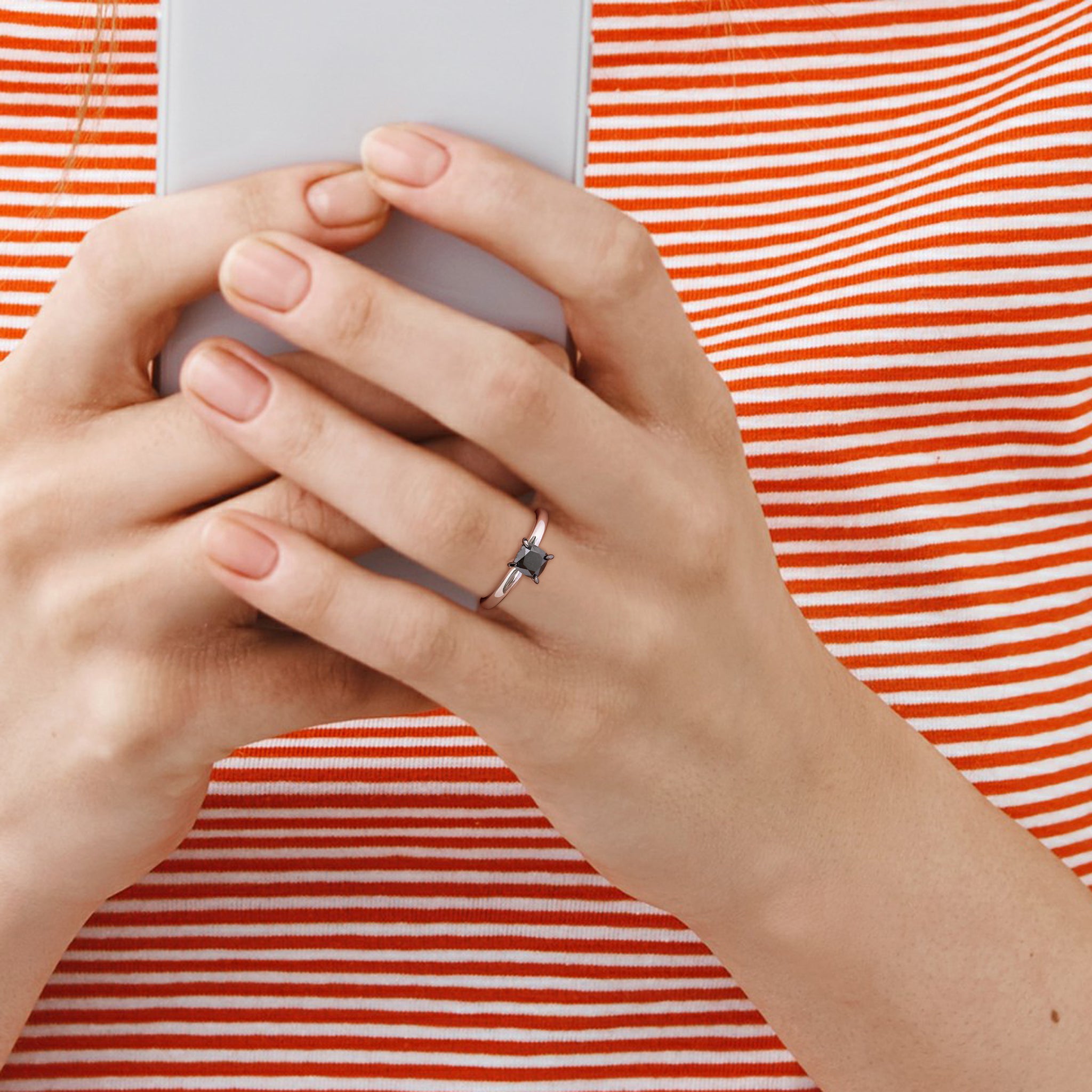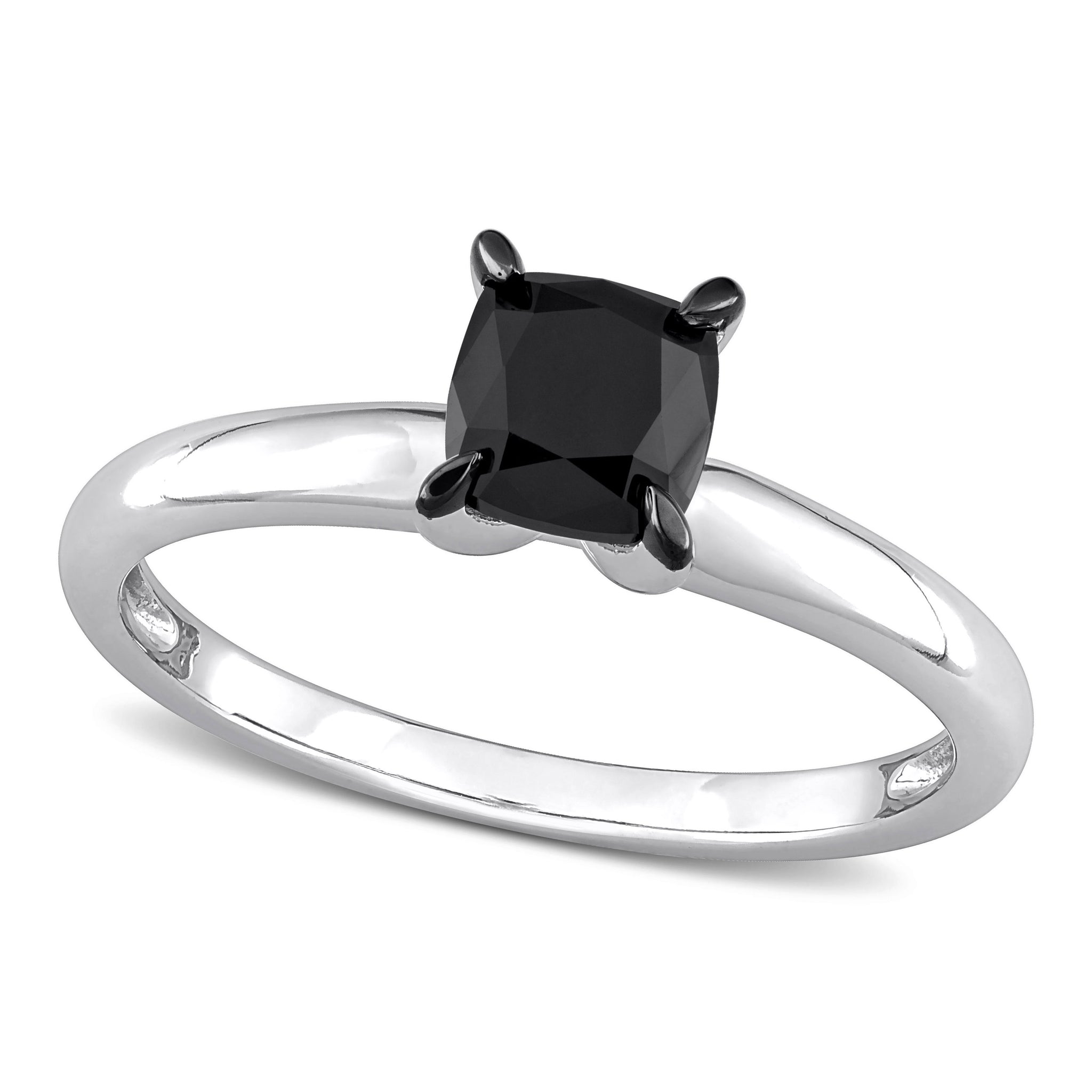 A perfect gift for your beloved one, this glamorous solitaire ring features a cushion-cut prong-set black diamond center stone crafted in 14k white gold with black rhodium plating.