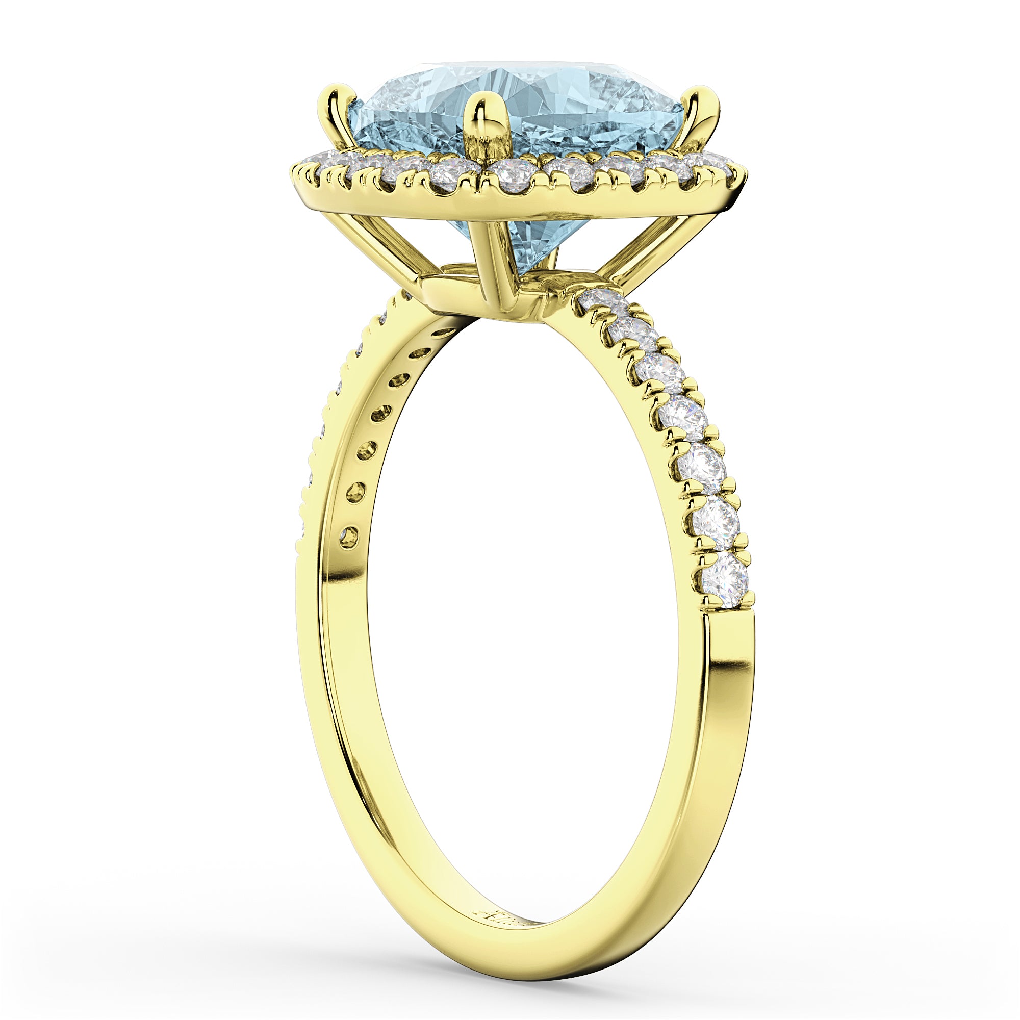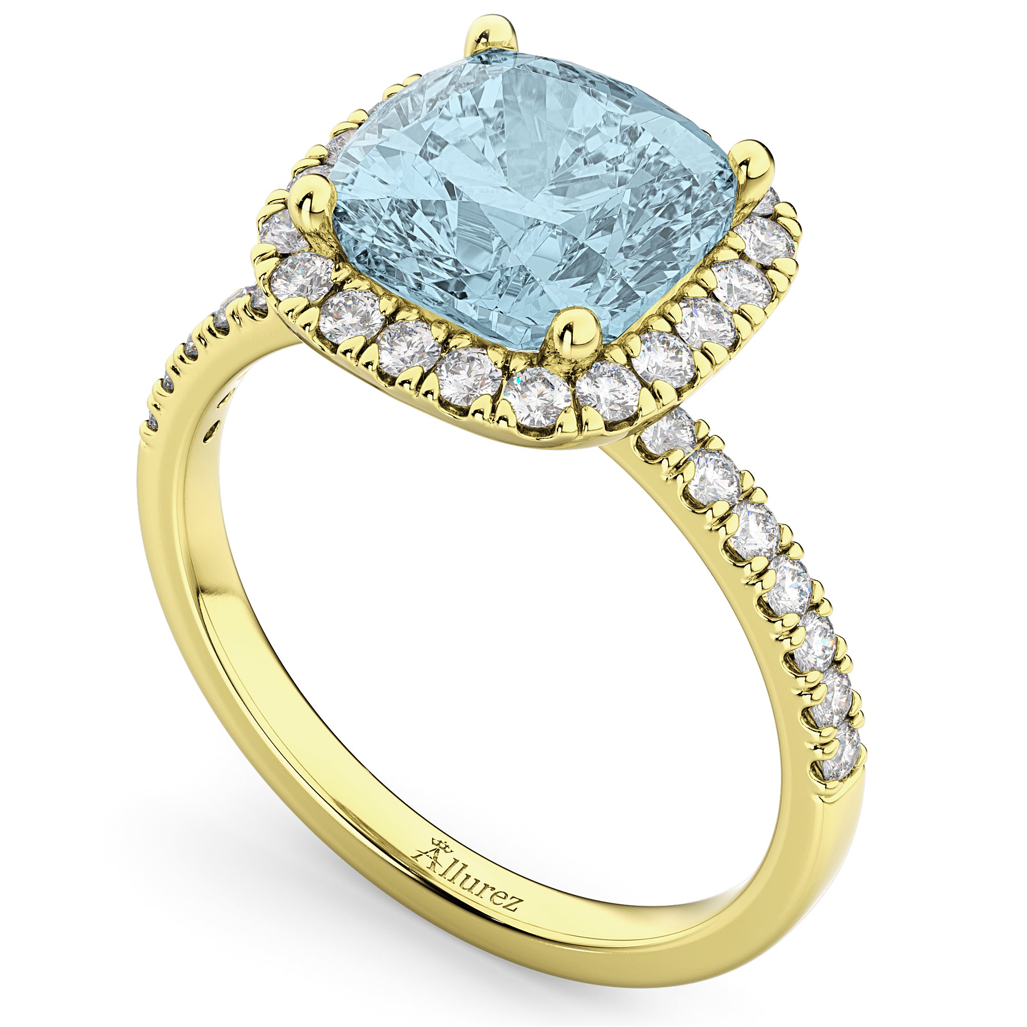 This eye-catching halo diamond ring features 0.51ct total weight of accent diamonds on the thin, 14k Yellow Gold band, as well as surrounding a 2.60ct cushion cut Aquamarine.