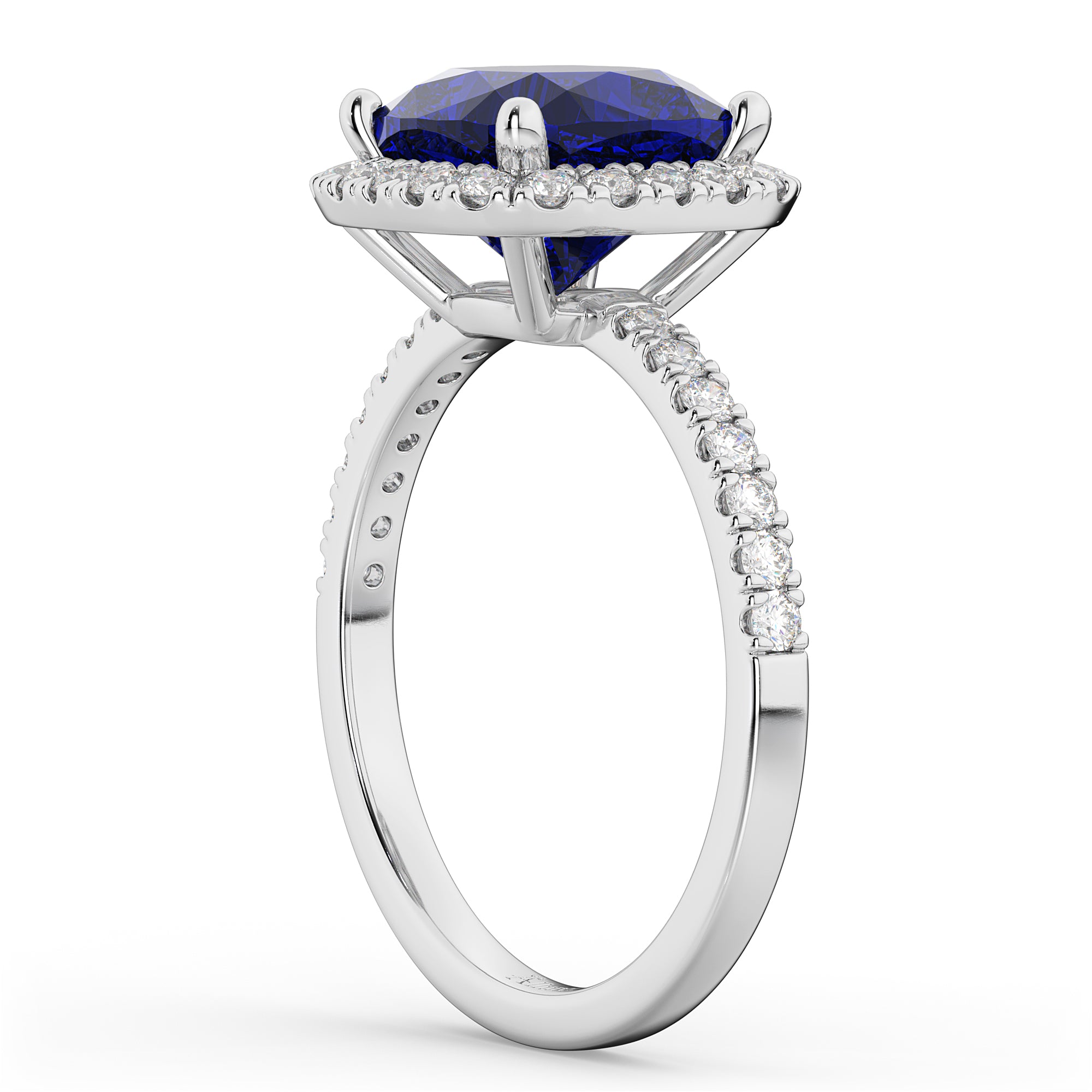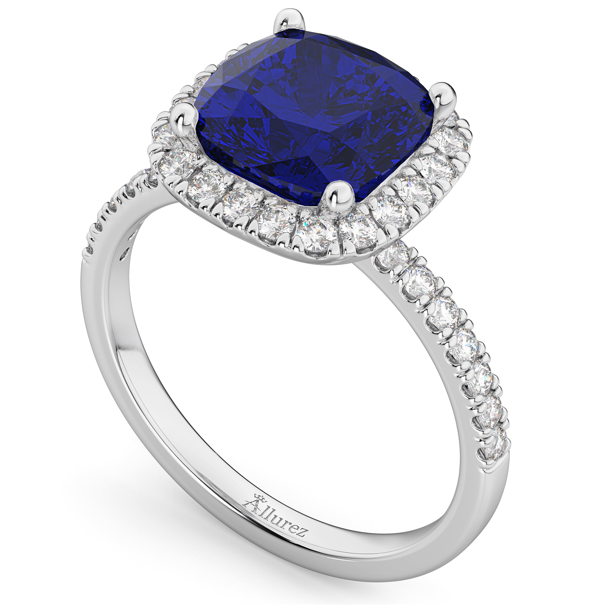 Cushion Cut Halo Blue Sapphire & Diamond Engagement Ring 14k White Gold (3.11ct)