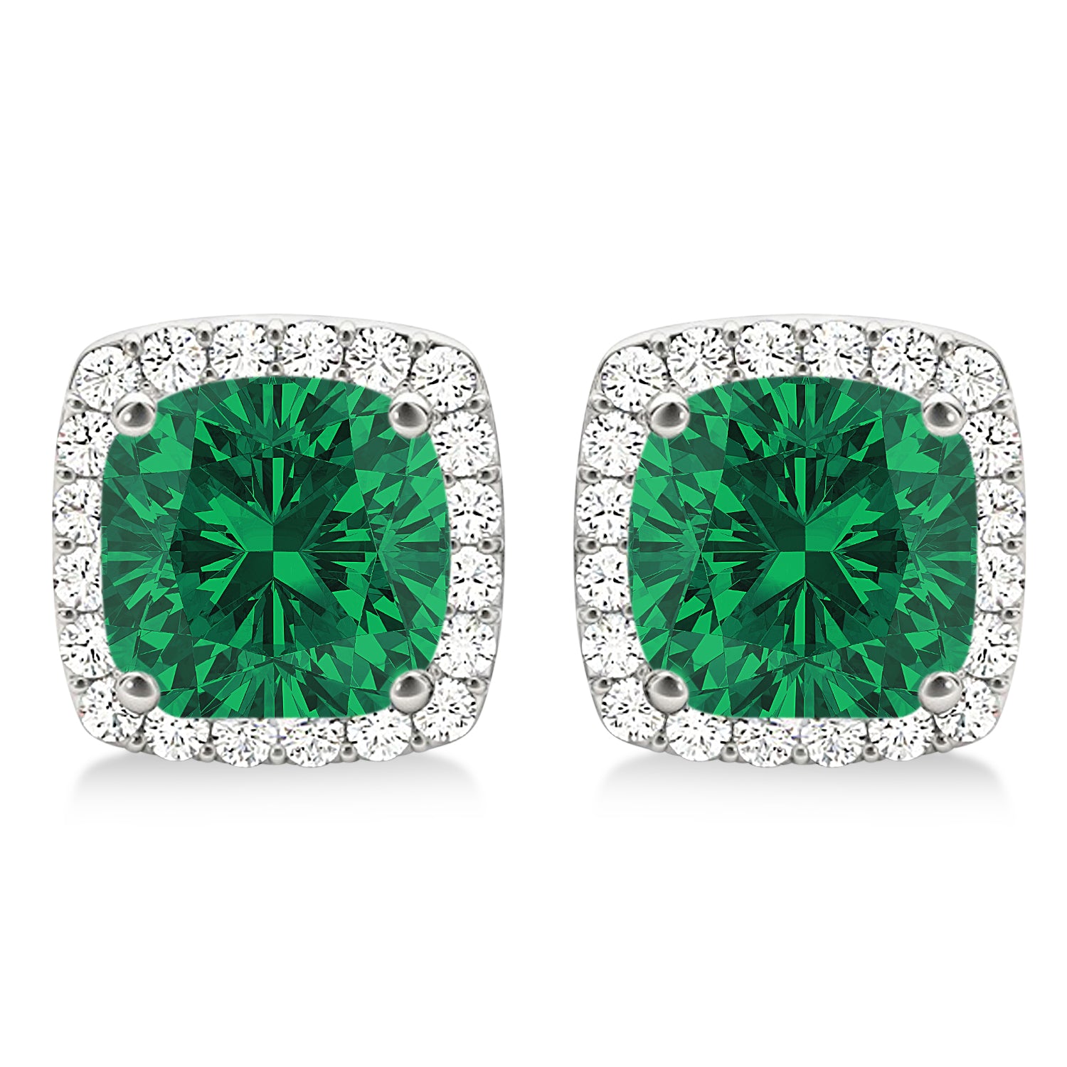 These 14k white gold lab emerald and lab grown diamond halo cushion earrings are absolutely gorgeous.