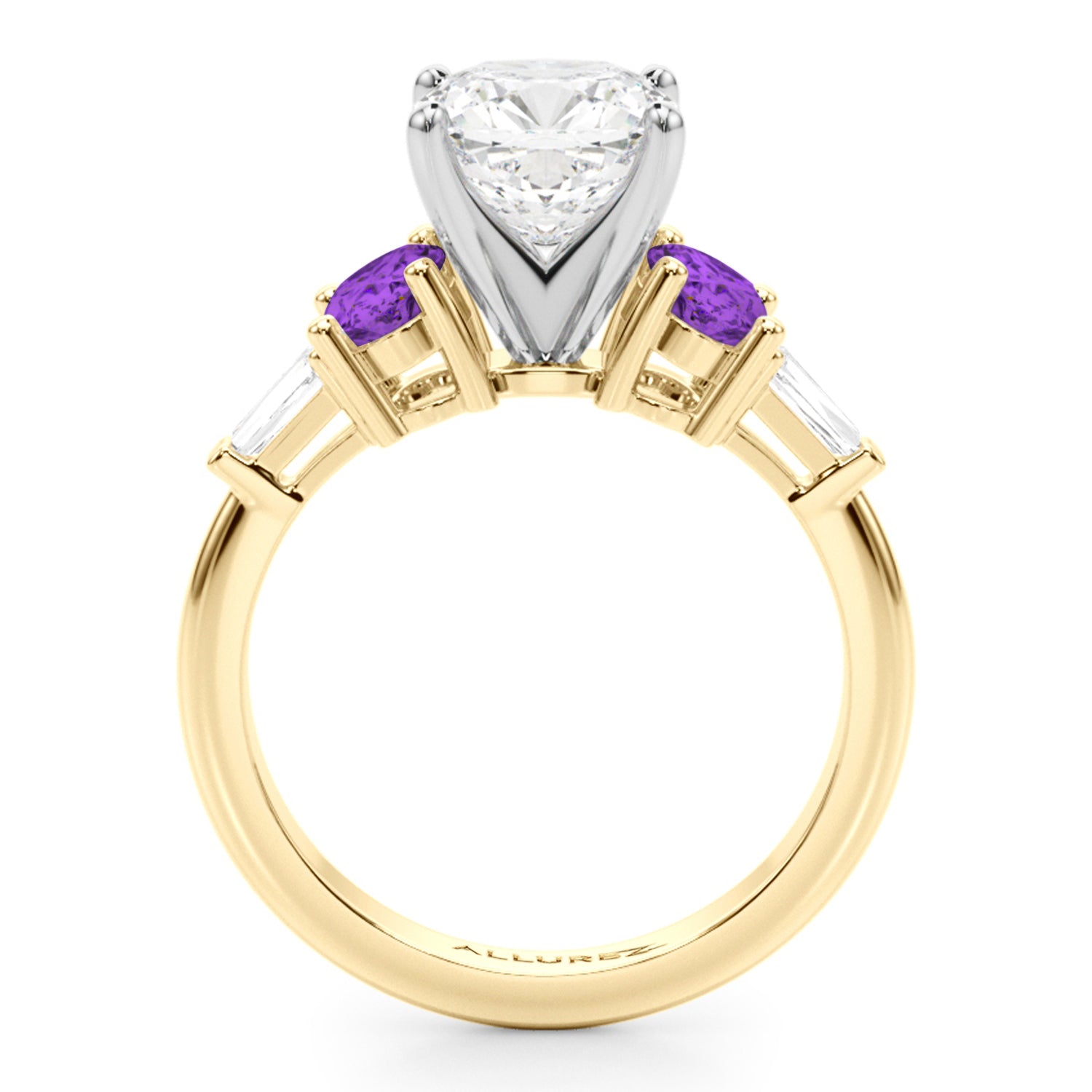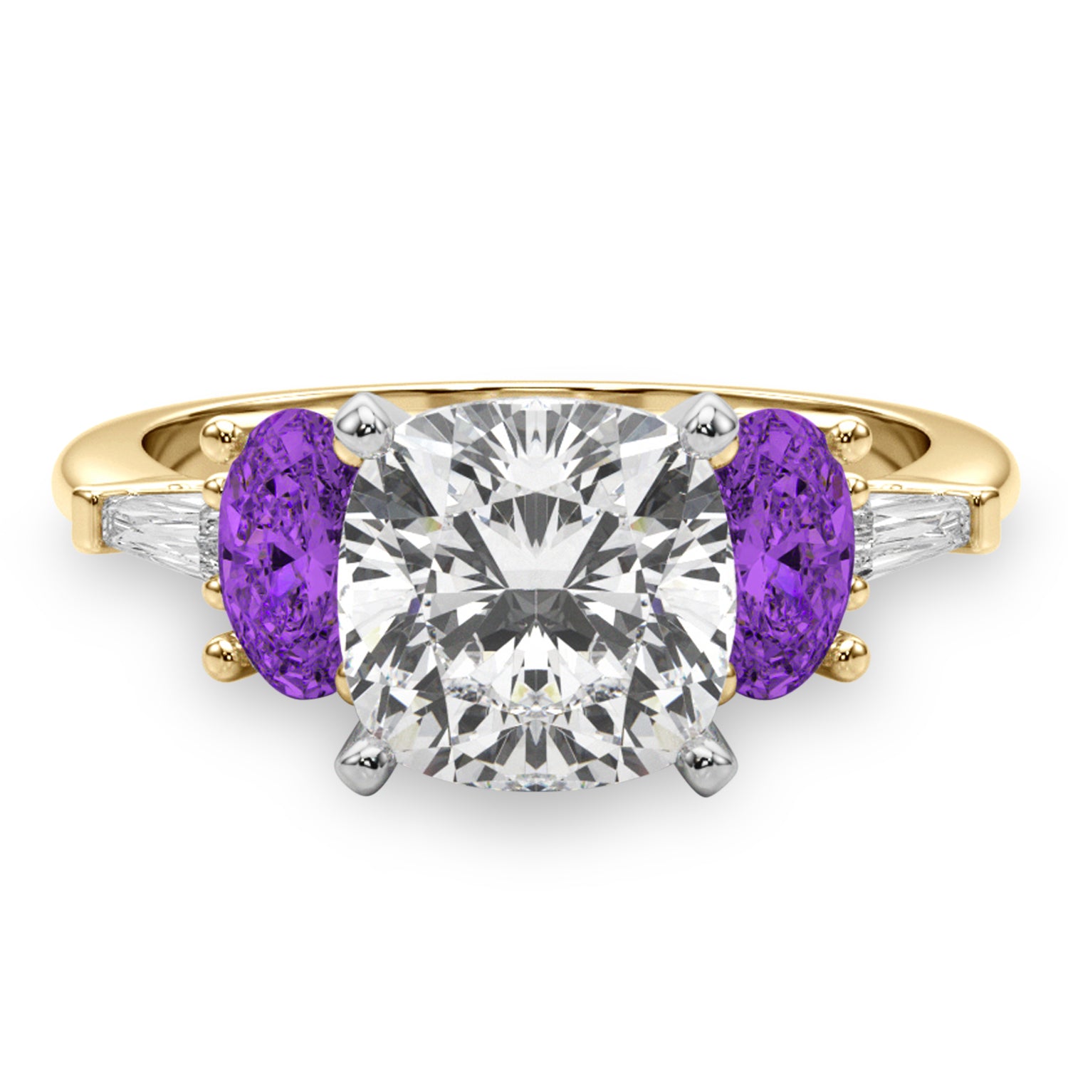 Discover the elegance of the Cushion Cut Lab Diamond & Oval Amethyst Engagement Ring, meticulously crafted in 14K Yellow Gold, showcasing a stunning 3.98-carat brilliance. The centerpiece is a breathtaking 3-carat Cushion Cut diamond, surrounded by two oval 0.40-carat Amethyst side stones (5.8x4.1mm) and two taper baguette 0.09-carat accent stones (4.02x1.5mm).