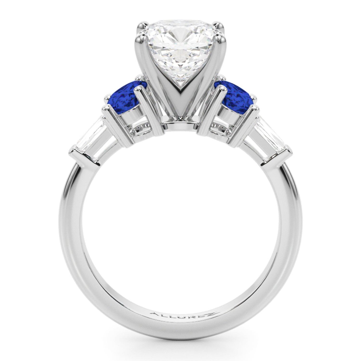 Discover the elegance of the Cushion Cut Lab Diamond & Oval Blue Sapphire Engagement Ring, meticulously crafted in Platinum, showcasing a stunning 4.32-carat brilliance. The centerpiece is a breathtaking 3-carat Cushion Cut diamond, surrounded by two oval 0.57-carat Blue Sapphire side stones (5.8x4.1mm) and two taper baguette 0.09-carat accent stones (4.02x1.5mm).