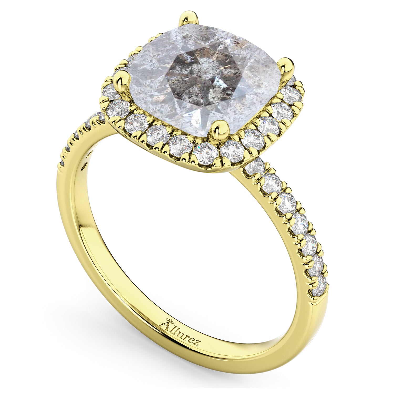 This eye-catching halo diamond ring features 0.51ct total weight of accent diamonds on the thin, 14k Yellow Gold band, as well as surrounding a 2.04ct cushion cut Salt & Pepper diamond.